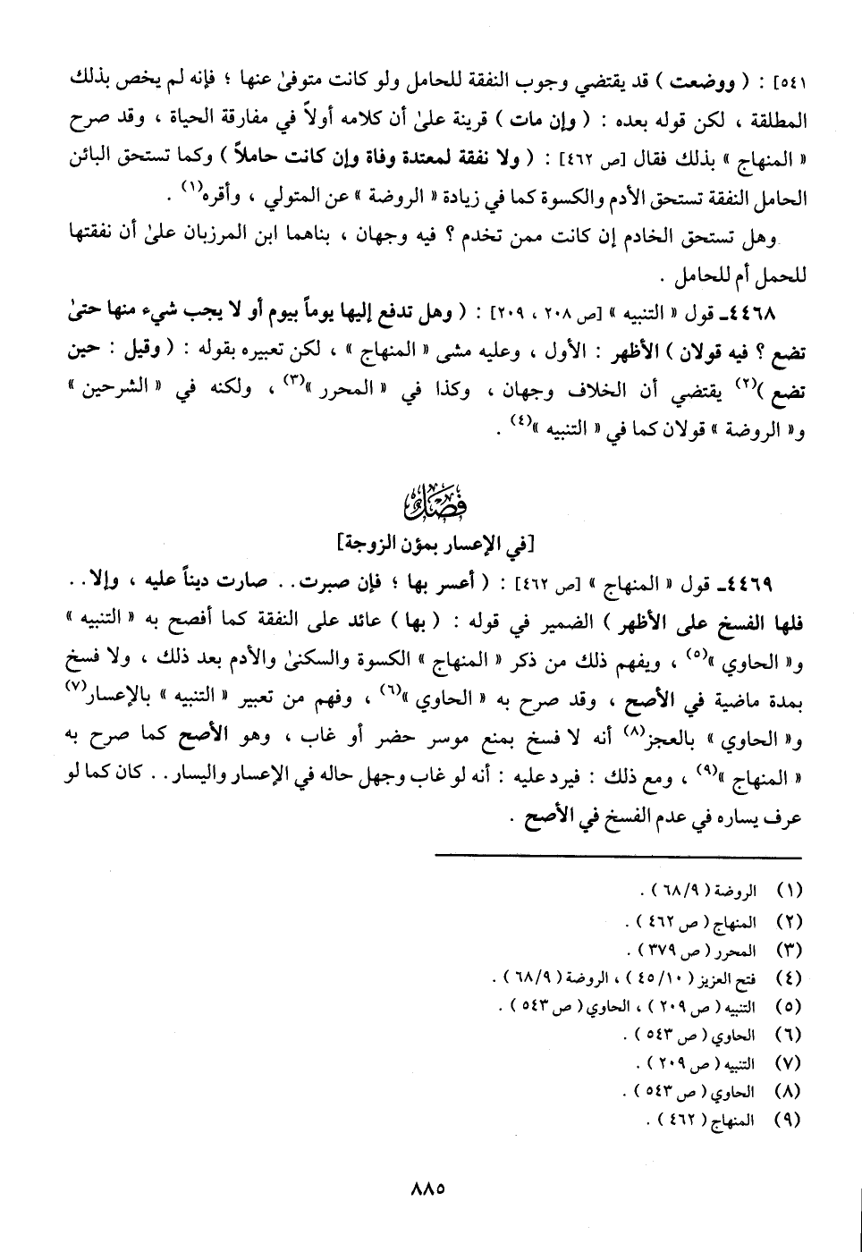 4469 - قول "المنهاج" [ص 462]: (أعسر بها؛ فإن صبرت .. صارت دينًا عليه، وإلا .. فلها الفسخ على الأظهر) الضمير في قوله: (بها) عائد على النفقة كما أفصح به "التنبيه" و "الحاوي" (¬5)، ويفهم ذلك من ذكر "المنهاج" الكسوة والسكنى والأدم بعد ذلك، ولا فسخ بمدة ماضية في الأصح، وقد صرح به "الحاوي" (¬6)، وفهم من تعبير "التنبيه" بالإعسار (¬7) و "الحاوي" بالعجز (¬8) أنه لا فسخ بمنع موسر حضر أو غاب، وهو الأصح كما صرح به "المنهاج" (¬9)، ومع ذلك: فيرد عليه: أنه لو غاب وجهل حاله في الأعسار واليسار .. كان كما لو عرف يساره في عدم الفسخ في الأصح.
