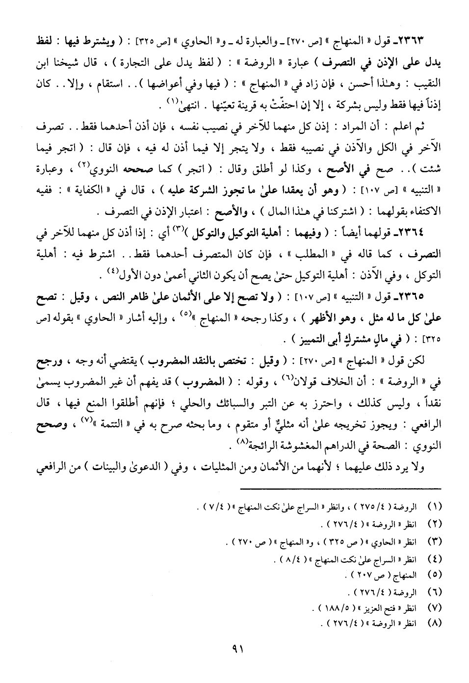 2363 - قول " المنهاج " [ص 270]- والعبارة له - و" الحاوي " [ص 325]: (ويشترط فيها: لفظ يدل على الإذن في التصرف) عبارة " الروضة ": (لفظ يدل على التجارة)، قال شيخنا ابن النقيب: وهذا أحسن، فإن زاد في " المنهاج ": (فيها وفي أعواضها) .. استقام، وإلا .. كان إذنًا فيها فقط وليس بشركة، إلا إن احتفّتْ به قرينة تعيّنها. انتهى (¬1).