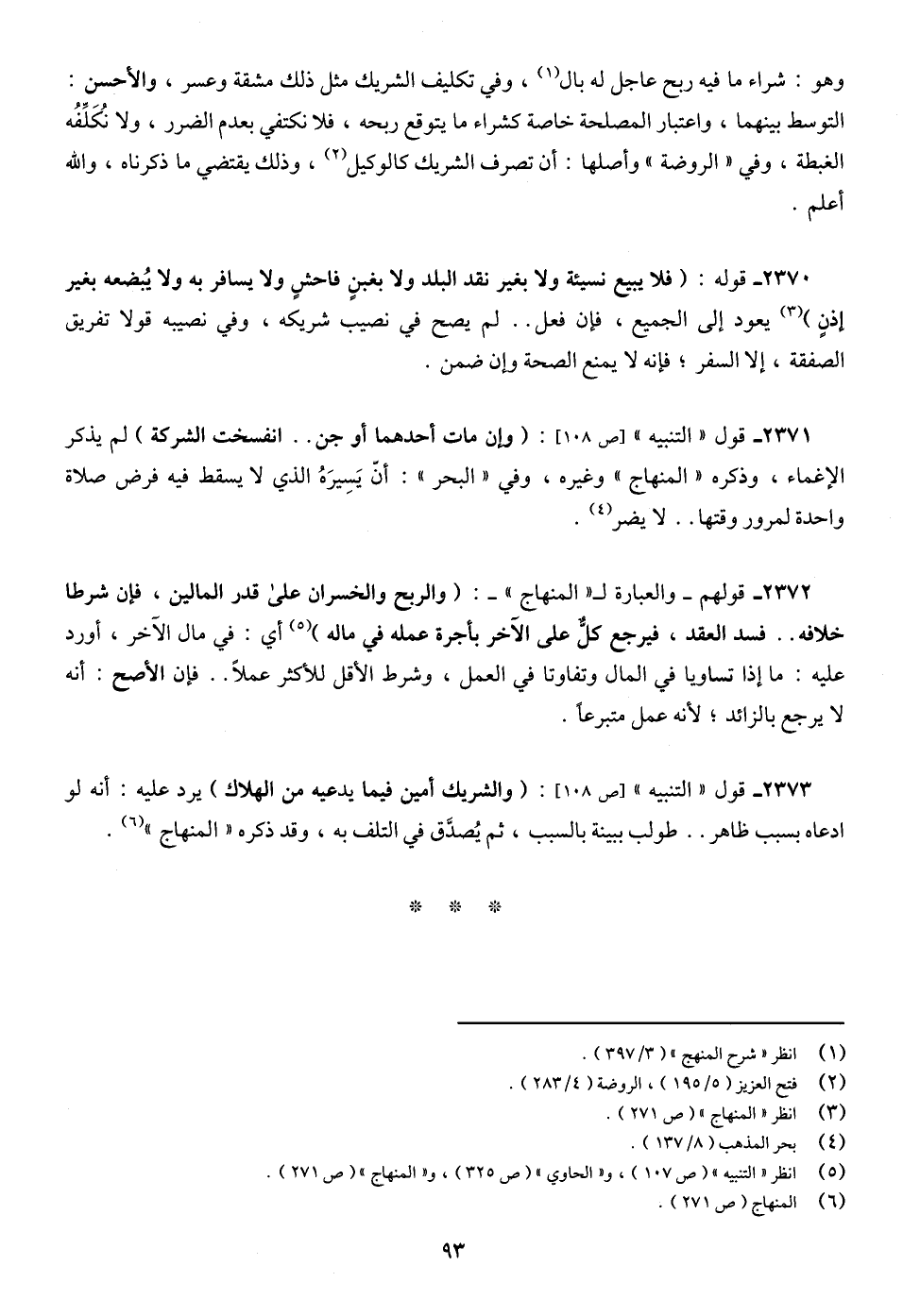 2373 - قول " التنبيه " [ص 108]: (والشريك أمين فيما يدعيه من الهلاك) يرد عليه: أنه لو ادعاه بسبب ظاهر .. طولب ببينة بالسبب، ثم يُصدَّق في التلف به، وقد ذكره " المنهاج " (¬6).