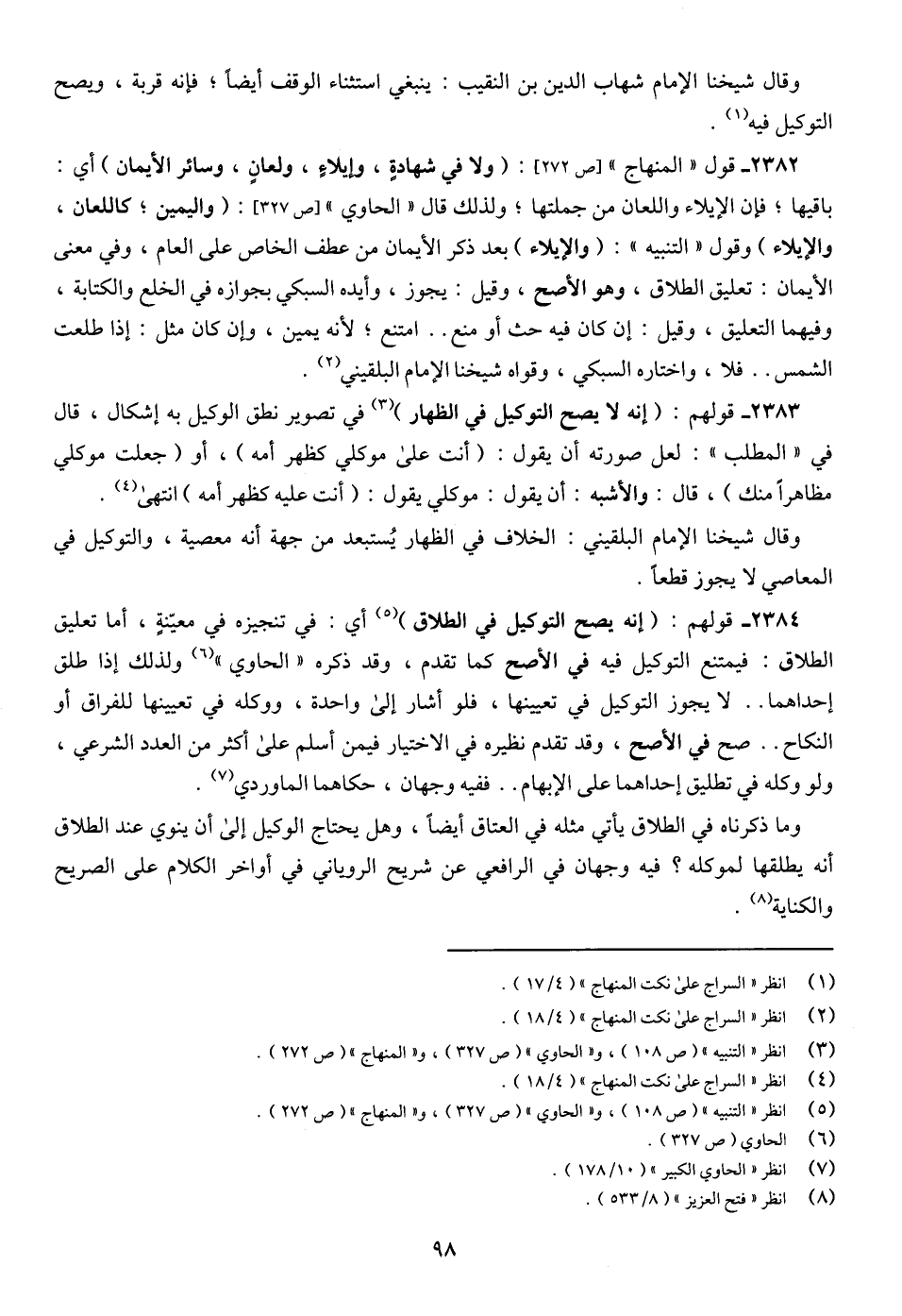 2383 - قولهم: (إنه لا يصح التوكيل في الظهار) (¬3) في تصوير نطق الوكيل به إشكال. قال في "المطلب": لعل صورته أن يقول: (أنت على موكلي كظهر أمه)، أو (جعلت موكلي مظاهراً منك)، قال: والأشبه: أن يقول: موكلي يقول: (أنت عليه كظهر أمه) انتهى (¬4).