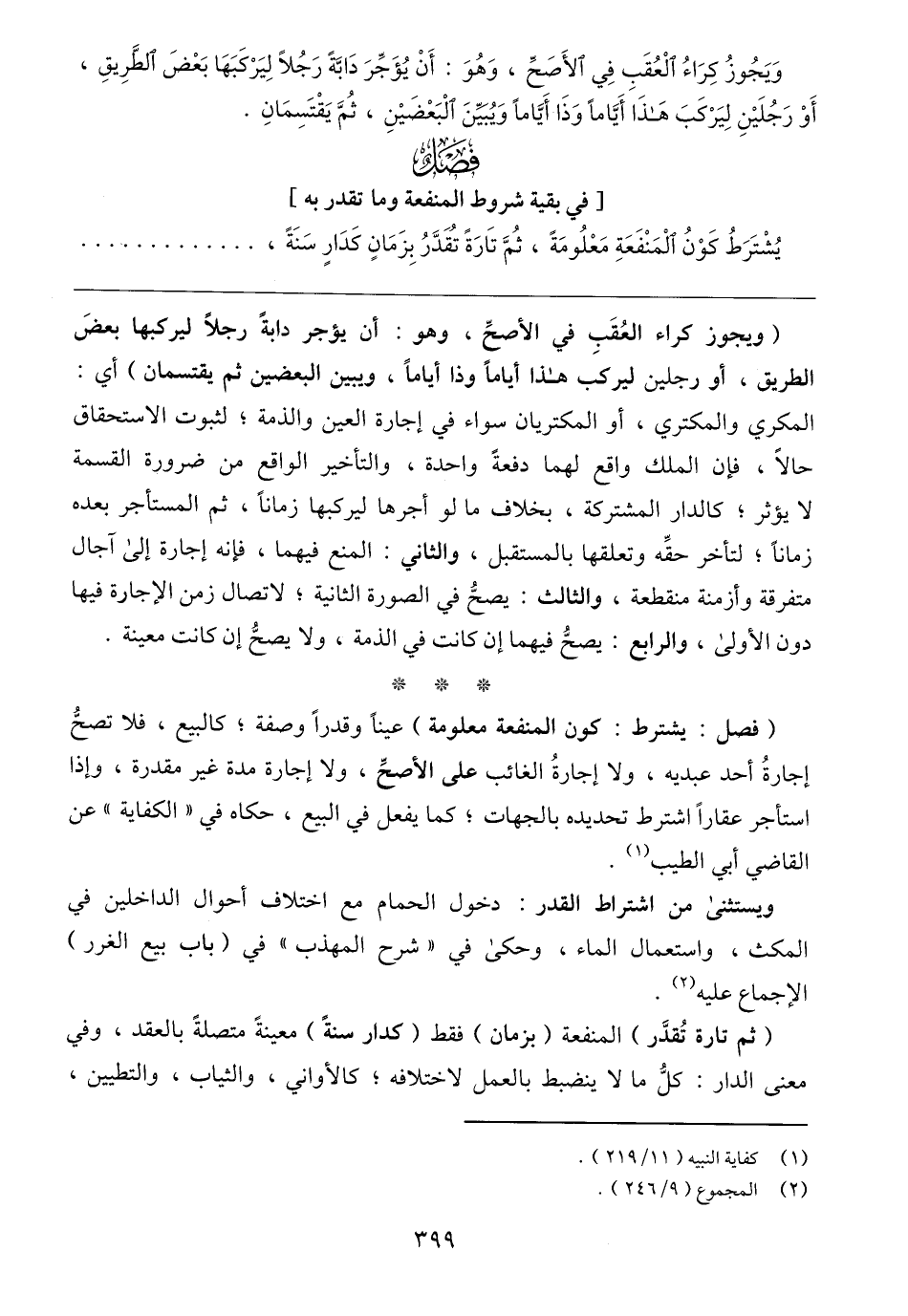 (ويجوز كراء العُقَبِ في الأصحِّ، وهو: أن يؤجر دابةً رجلًا ليركبها بعضَ الطريق، أو رجلين ليركب هذا أيامًا وذا أيامًا، ويبين البعضين ثم يقتسمان) أي: المكري والمكتري، أو المكتريان سواء في إجارة العين والذمة؛ لثبوت الاستحقاق حالًا، فإن الملك واقع لهما دفعةً واحدة، والتأخير الواقع من ضرورة القسمة لا يؤثر؛ كالدار المشتركة، بخلاف ما لو أجرها ليركبها زمانًا، ثم المستأجر بعده زمانًا؛ لتأخر حقِّه وتعلقها بالمستقبل، والثاني: المنع فيهما، فإنه إجارة إلى آجال متفرقة وأزمنة منقطعة، والثالث: يصحُّ في الصورة الثانية؛ لاتصال زمن الإجارة فيها دون الأولى، والرابع: يصحُّ فيهما إن كانت في الذمة، ولا يصحُّ إن كانت معينة.
