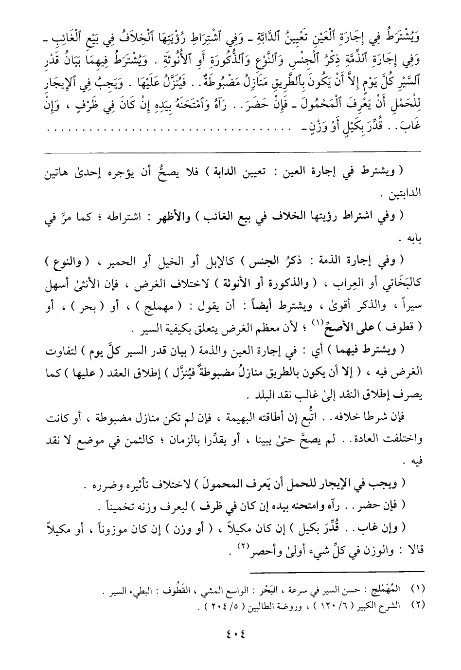 (ويشترط فيهما) أي: في إجارة العين والذمة (بيان قدر السير كلَّ يوم) لتفاوت الغرض فيه، (إلا أن يكون بالطريق منازلُ مضبوطة فيُنزَّل) إطلاق العقد (عليها) كما يصرف إطلاق النقد إلى غالب نقد البلد.