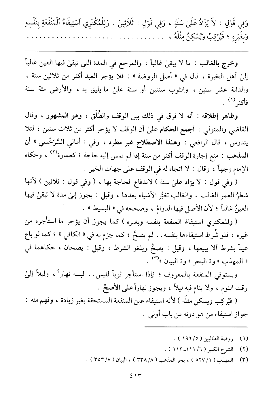 وظاهر إطلاقه: أنه لا فرق في ذلك بين الوقف والطِّلْق، وهو المشهور، وقال القاضي والمتولي: أجمع الحكام على أن الوقف لا يؤجر أكثر من ثلاث سنين؛ لئلا يندرس، قال الرافعي: وهذا الاصطلاح غير مطرد، وفي "أمالي السَّرَخْسي" أن المذهب: منع إجارة الوقف أكثر من سنة إذا لم تمس إليه حاجة، كعمارة (٢)، وحكاه الإمام وجهًا، وقال: لا اتجاه له في الوقف على جهات الخير.