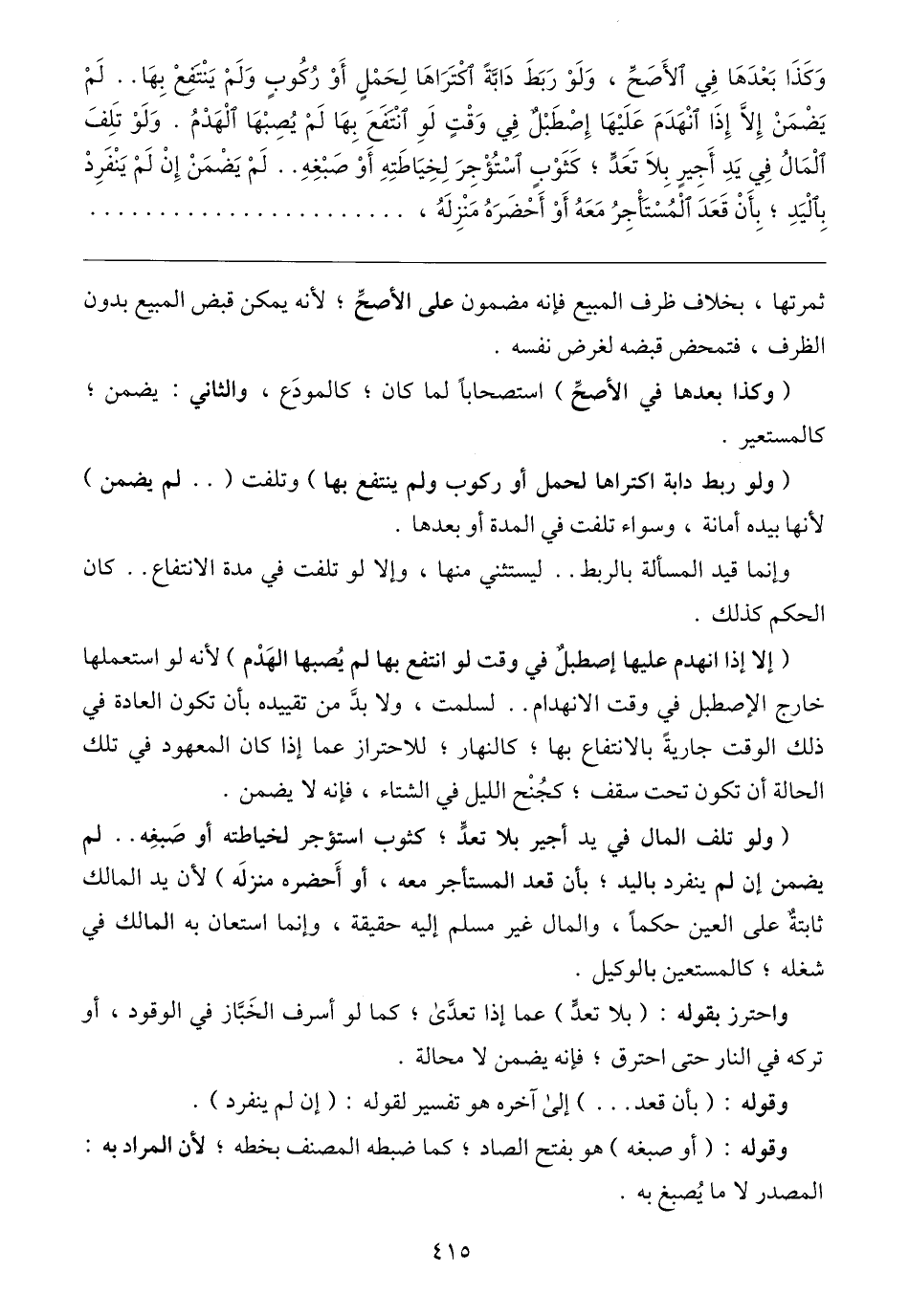 (إلا إذا انهدم عليها إصطبلٌ في وقت لو انتفع بها لم يُصبها الهَدْم) لأنه لو استعملها خارج الإصطبل في وقت الانهدام .. لسلمت، ولا بدَّ من تقييده بأن تكون العادة في ذلك الوقت جاريةً بالانتفاع بها، كالنهار، للاحتراز عما إذا كان المعهود في تلك الحالة أن تكون تحت سقف؛ كجُنْح الليل في الشتاء، فإنه لا يضمن.