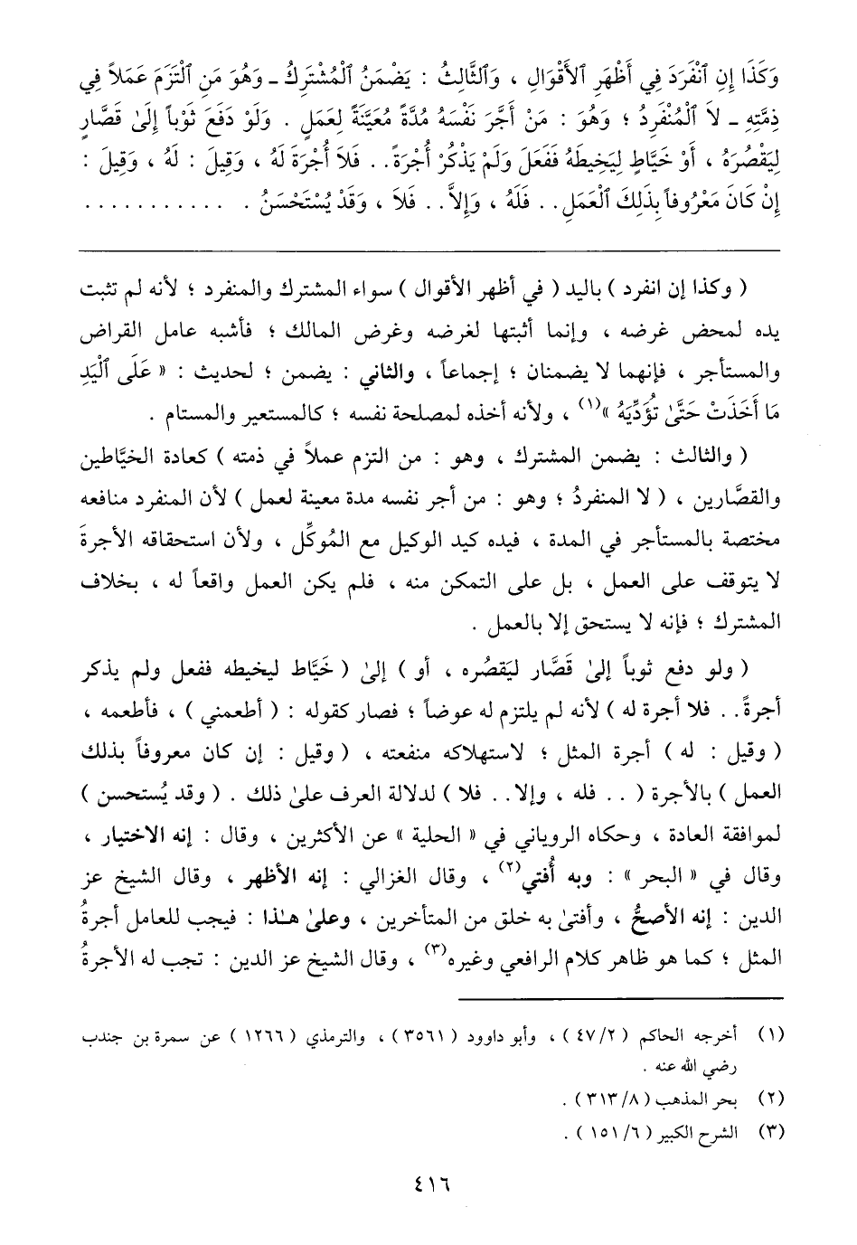 (وكذا إن انفرد) باليد (في أظهر الأقوال) سواء المشترك والمنفرد؛ لأنه لم تثبت يده لمحض غرضه، وإنما أثبتها لغرضه وغرض المالك؛ فأشبه عامل القراض والمستأجر، فإنهما لا يضمنان؛ إجماعًا، والثاني: يضمن؛ لحديث: "عَلَى الْيَدِ مَا أَخَذَتْ حَتَّى تُؤَدِّيَهُ" (١)، ولأنه أخذه لمصلحة نفسه؛ كالمستعير والمستام.