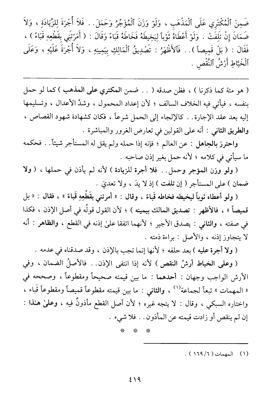 (هو مئة كما ذكرنا)، فظن صدقه ( .. ضمن المكتري على المذهب) كما لو حمل بنفسه، فيأتي فيه الخلاف السالف، لأن إعداد المحمول، وشدَّ الأعدال، وتسليمها إليه بعد عقد الإجارة .. كالإلجاء إلى الحمل شرعًا، فكان كشهادة شهود القصاص، والطريق الثاني: أنه على القولين في تعارض الغرور والمباشرة.