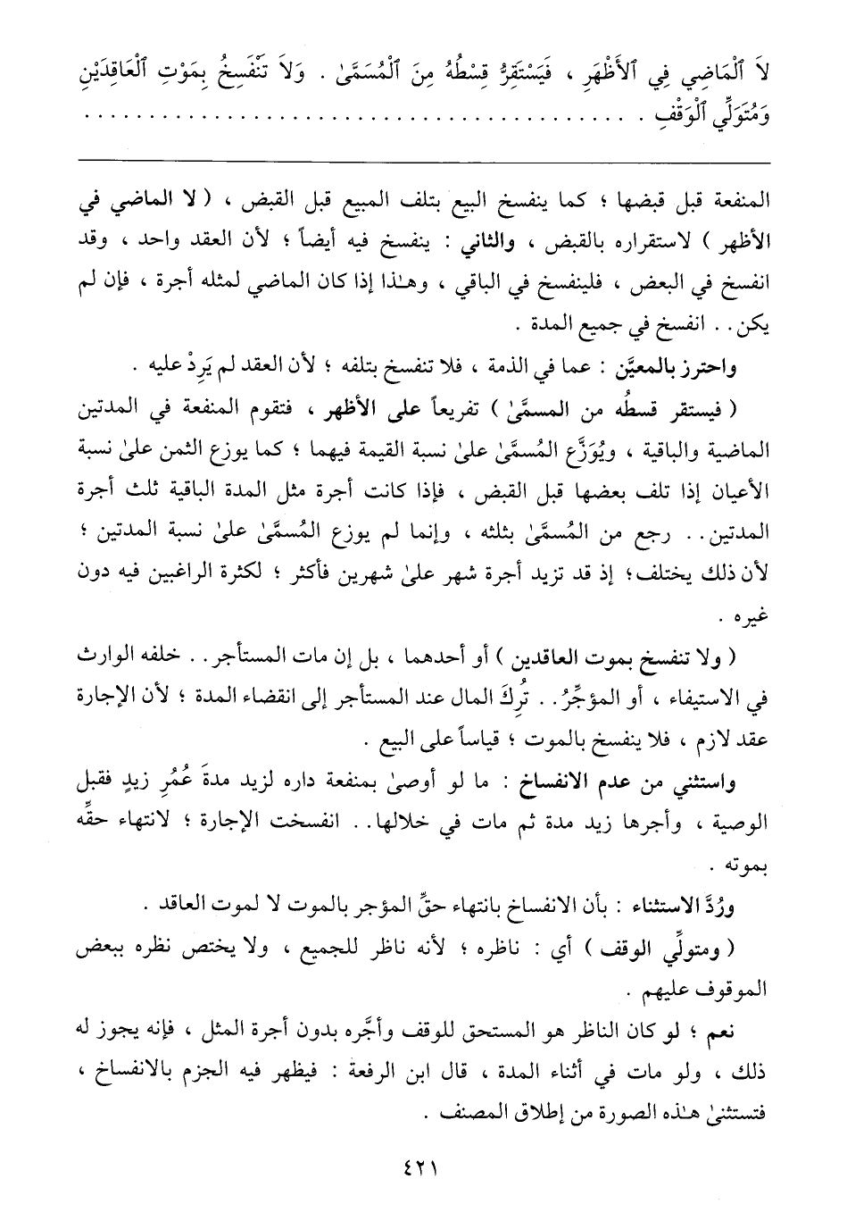 المنفعة قبل قبضها؛ كما ينفسخ البيع بتلف المبيع قبل القبض، (لا الماضي في الأظهر) لاستقراره بالقبض، والثاني: ينفسخ فيه أيضًا؛ لأن العقد واحد، وقد انفسخ في البعض، فلينفسخ في الباقي، وهذا إذا كان الماضي لمثله أجرة، فإن لم يكن. . انفسخ في جميع المدة.