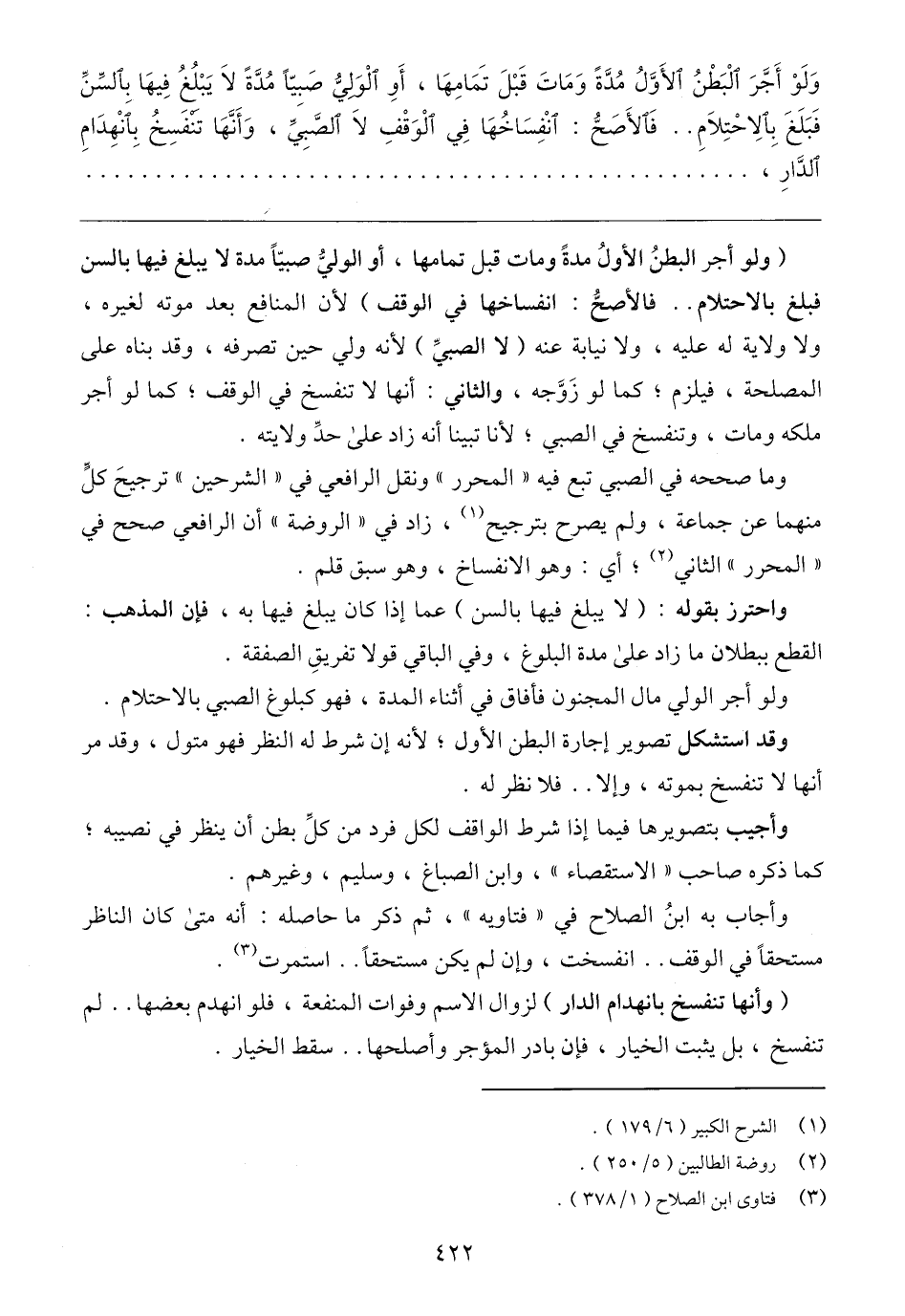 (ولو أجر البطنُ الأولُ مدةً ومات قبل تمامها، أو الوليُّ صبيًّا مدة لا يبلغ فيها بالسن فبلغ بالاحتلام. . فالأصحُّ: انفساخها في الوقف) لأن المنافع بعد موته لغيره، ولا ولاية له عليه، ولا نيابة عنه (لا الصبيِّ) لأنه ولي حين تصرفه، وقد بناه على المصلحة، فيلزم؛ كما لو زَوَّجه، والثاني: أنها لا تنفسخ في الوقف؛ كما لو أجر ملكه ومات، وتنفسخ في الصبي؛ لأنا تبينا أنه زاد على حدِّ ولايته.
