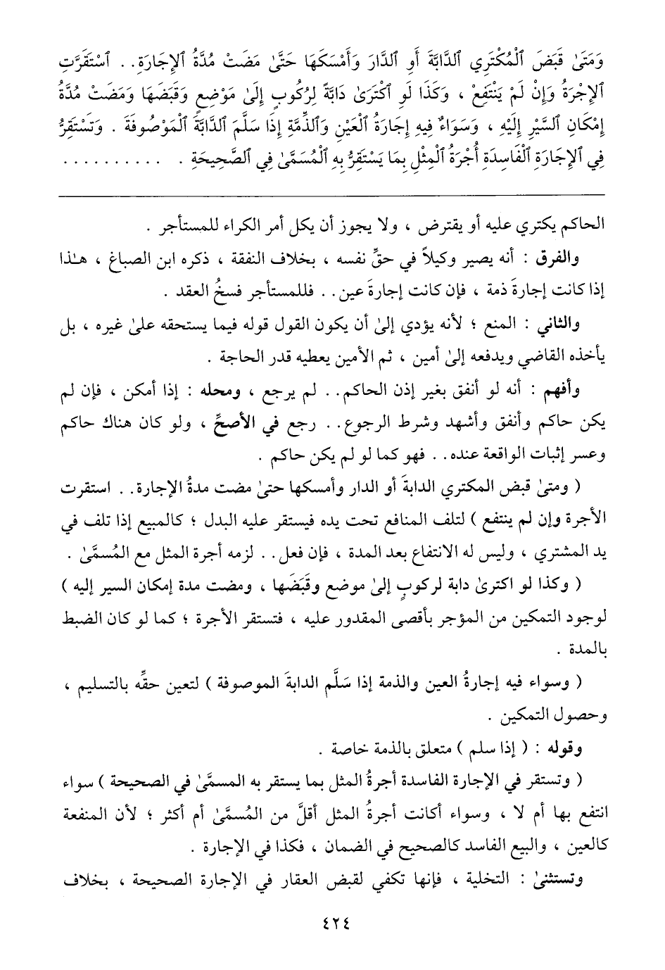 (ومتى قبض المكتري الدابةَ أو الدار وأمسكها حتى مضت مدةُ الإجارة. . استقرت الأجرة وإن لم ينتفع) لتلف المنافع تحت يده فيستقر عليه البدل؛ كالمبيع إذا تلف في يد المشتري، وليس له الانتفاع بعد المدة، فإن فعل. . لزمه أجرة المثل مع المُسمَّى.