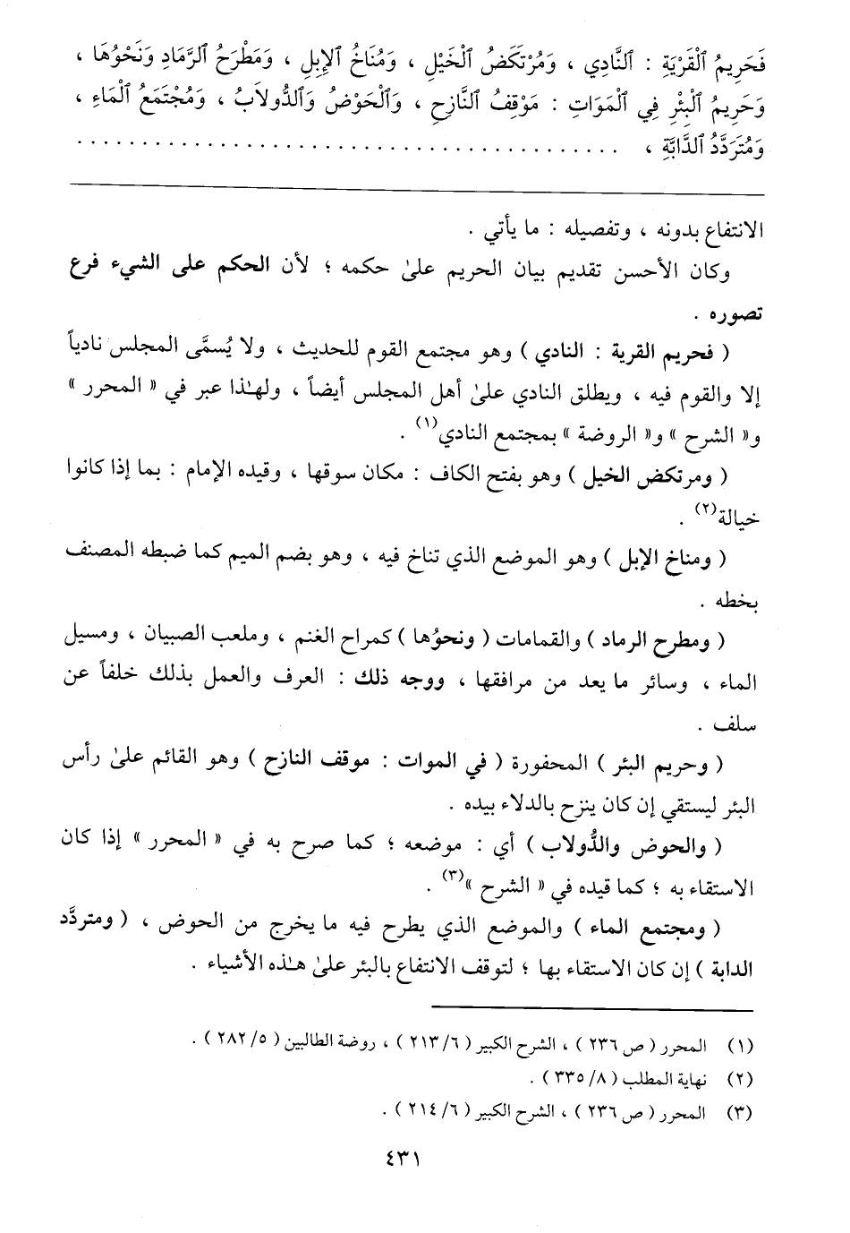 (فحريم القرية: النادي) وهو مجتمع القوم للحديث، ولا يُسمَّى المجلس ناديًا إلا والقوم فيه، ويطلق النادي على أهل المجلس أيضًا، ولهذا عبر في "المحرر" و"الشرح" و"الروضة" بمجتمع النادي (١).