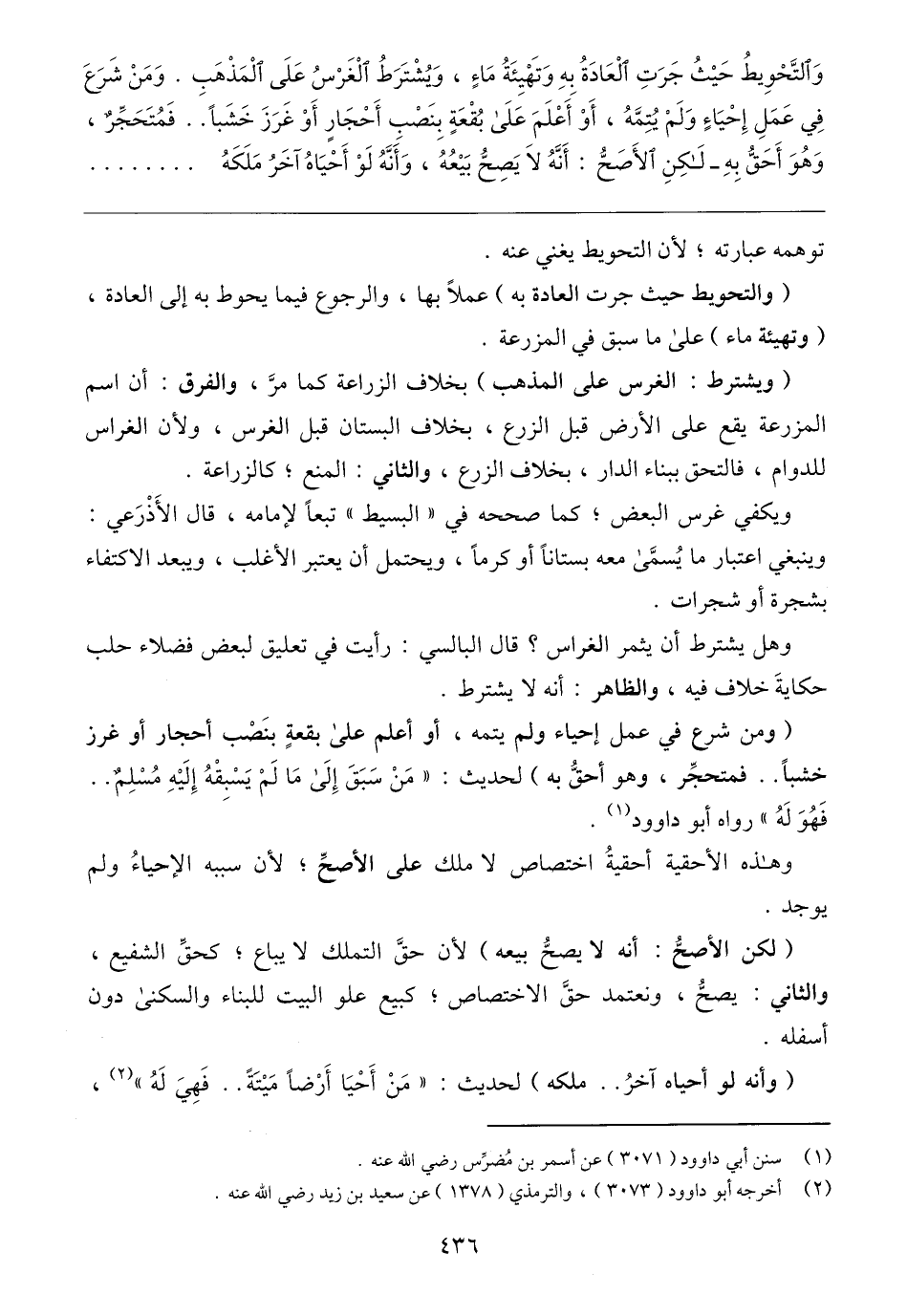 (ومن شرع في عمل إحياء ولم يتمه، أو أعلم على بقعةٍ بنَصْب أحجار أو غرز خشبًا. . فمتحجِّر، وهو أحقُّ به) لحديث: "مَنْ سَبَقَ إِلَى مَا لَمْ يَسْبقْهُ إِلَيْهِ مُسْلِمٌ. . فَهُوَ لَهُ" رواه أبو داوود (١).