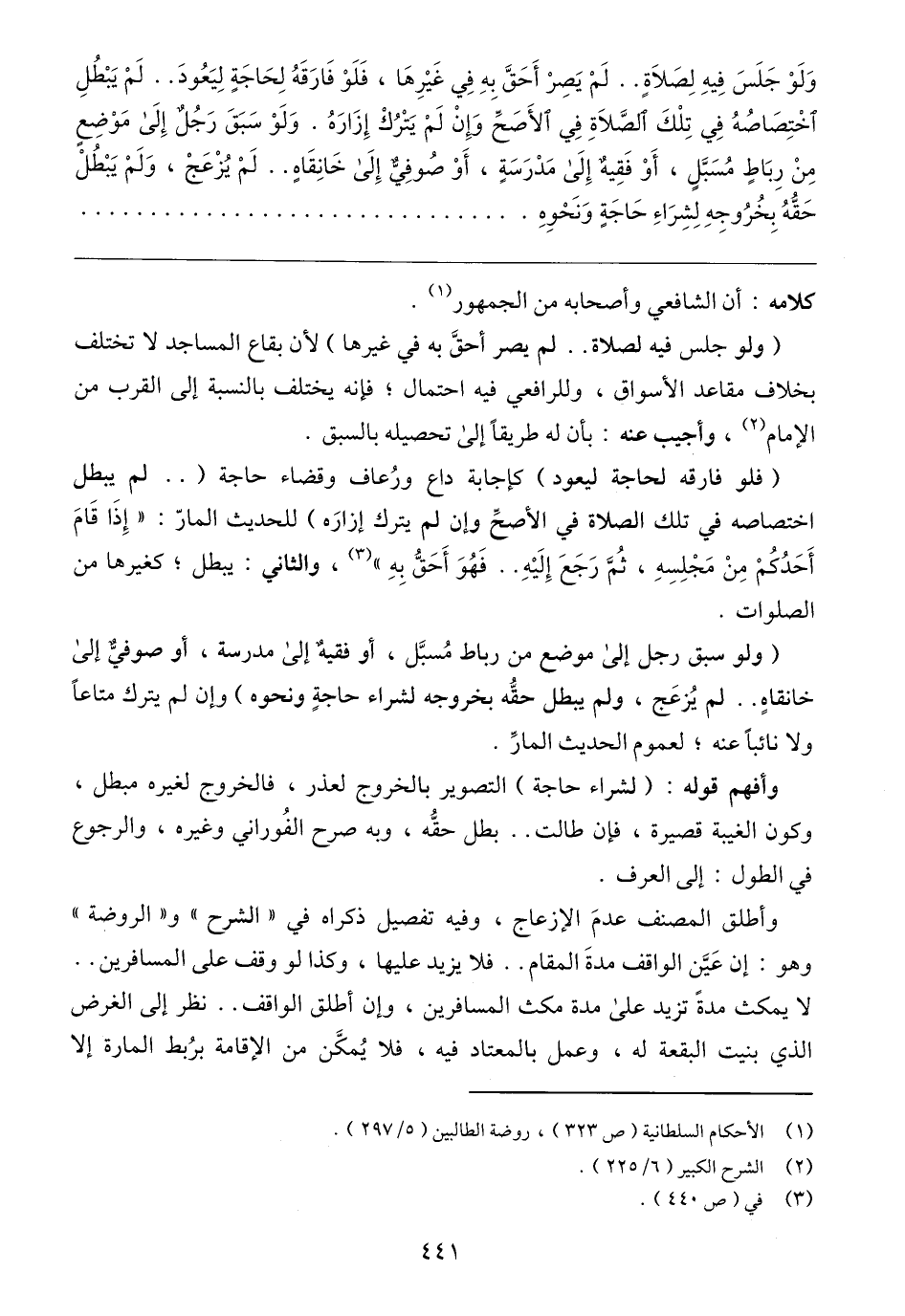 (فلو فارقه لحاجة ليعود) كإجابة داع ورُعاف وقضاء حاجة (. . لم يبطل اختصاصه في تلك الصلاة في الأصحِّ وإن لم يترك إزارَه) للحديث المارّ: "إِذَا قَامَ أَحَدُكُمْ مِنْ مَجْلِسِهِ، ثُمَّ رَجَعَ إِلَيْهِ. . فَهُوَ أَحَقُّ بِهِ" (٣)، والثاني: يبطل؛ كغيرها من الصلوات.