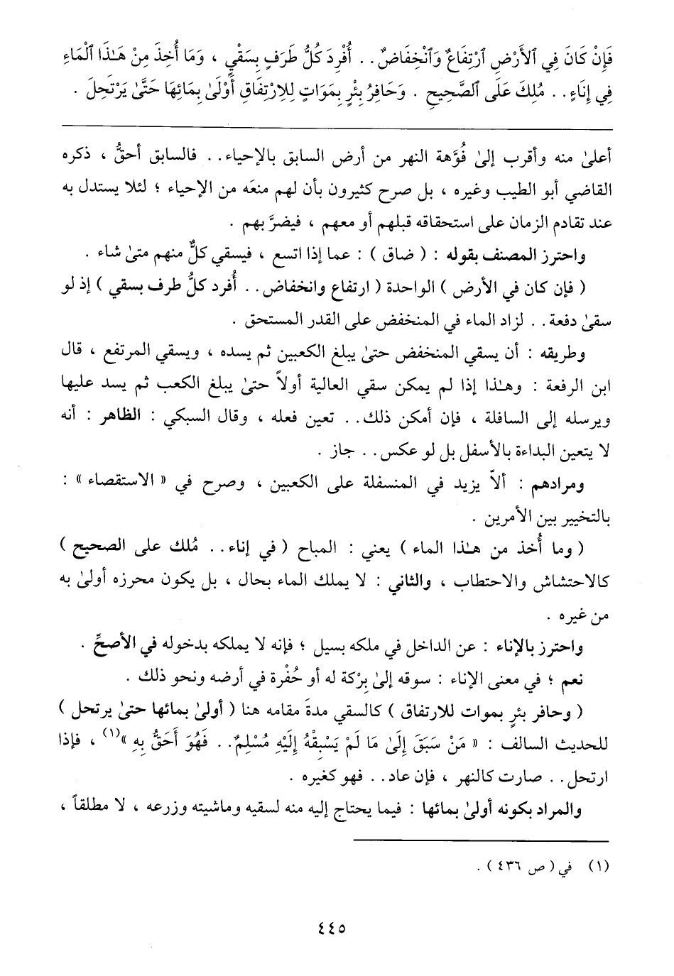 أعلى منه وأقرب إلى فُوَّهة النهر من أرض السابق بالإحياء. . فالسابق أحقُّ، ذكره القاضي أبو الطيب وغيره، بل صرح كثيرون بأن لهم منعَه من الإحياء؛ لئلا يستدل به عند تقادم الزمان على استحقاقه قبلهم أو معهم، فيضرَّ بهم.