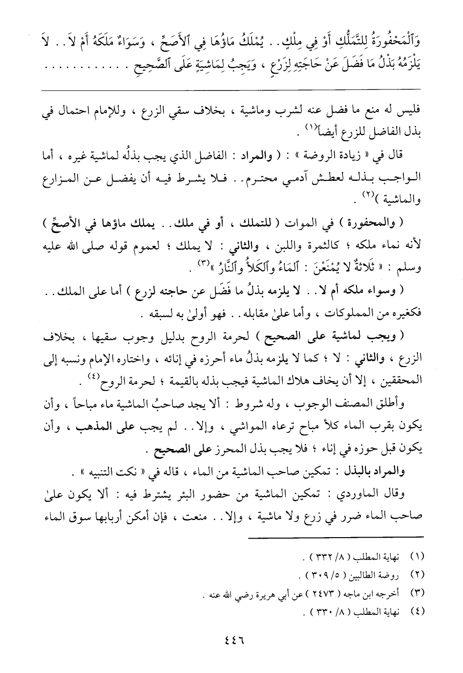 قال في "زيادة الروضة": (والمراد: الفاضل الذي يجب بذلُه لماشية غيره، أما الواجب بذله لعطش آدمي محترم. . فلا يشرط فيه أن يفضل عن المزارع والماشية) (٢).
