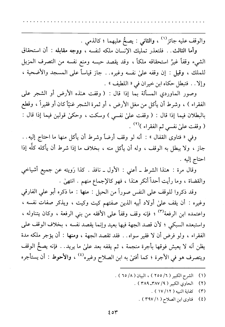 وقد ذكروا للوقف على النفس صورًا من الحيل: منها: ما ذكره أبو علي الفارقي وغيره: أن يقف على أولاد أبيه الذين صفتهم كيت وكيت، ويذكر صفات نفسه، واعتمده ابن الرفعة (٣)؛ فإنه وقف وقفًا على الأفقه من بني الرفعة، وكان يتناوله، واستبعده السبكي؛ لأن قصد الجهة فيها بعيد وإنما يقصد نفسه، بخلاف الوقف على الفقراء، ولو فرض أن لا فقير سواه. . فقد تقصد الجهة، ومنها: أن يؤجر ملكه مدة يظن أنه لا يعيش فوقها بأجرة منجمة، ثم يقفه بعد على ما يريد. . فإنه يصحُّ الوقف ويتصرف هو في الأجرة؛ كما أفتى به ابن الصلاح وغيره (٤)، والأحوط: أن يستأجره