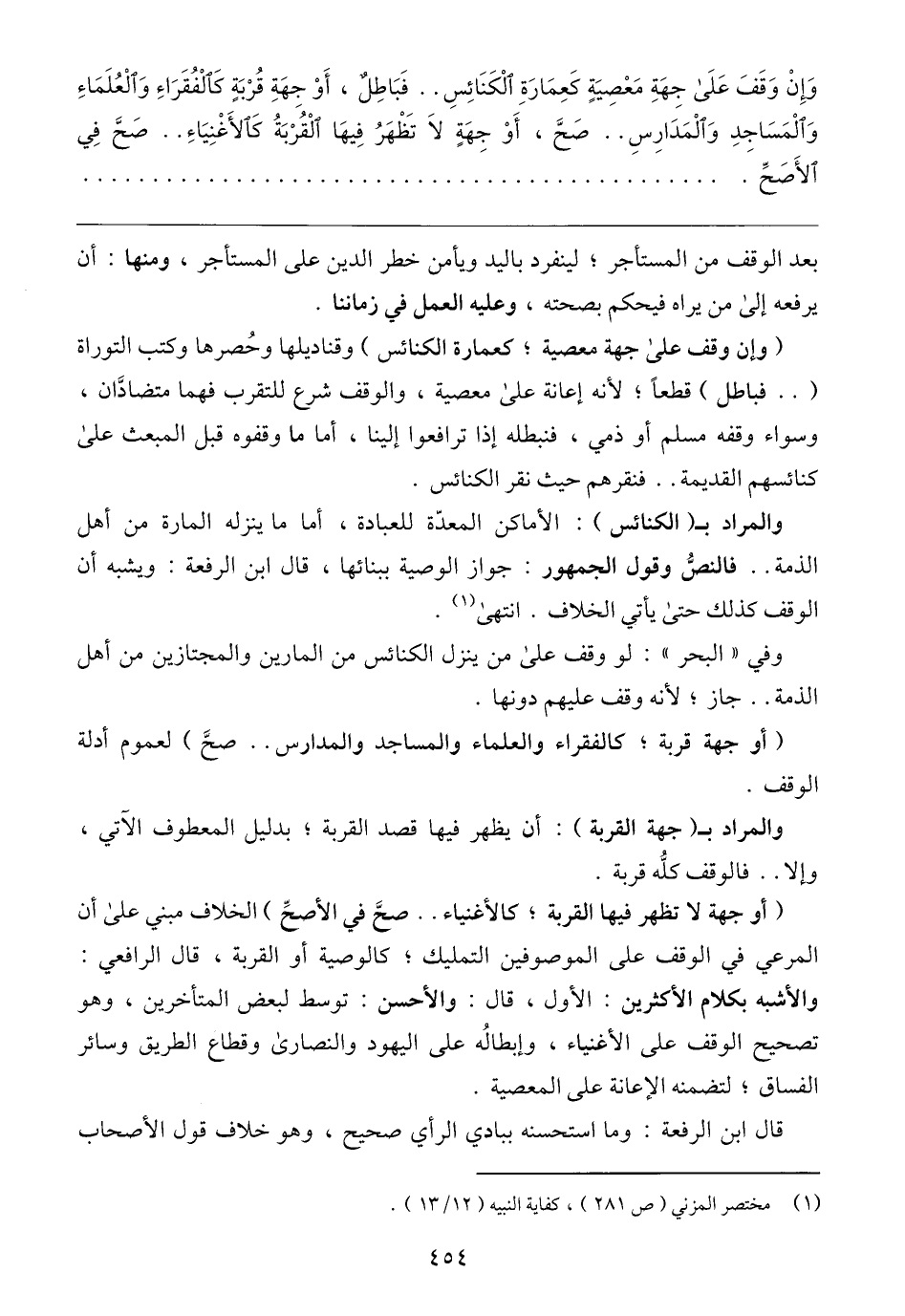 (وإن وقف على جهة معصية؛ كعمارة الكنائس) وقناديلها وحُصرها وكتب التوراة (. . فباطل) قطعًا؛ لأنه إعانة على معصية، والوقف شرع للتقرب فهما متضادَّان، وسواء وقفه مسلم أو ذمي، فنبطله إذا ترافعوا إلينا، أما ما وقفوه قبل المبعث على كنائسهم القديمة. . فنقرهم حيث نقر الكنائس.