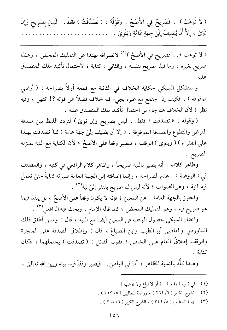 واستشكل السبكي حكاية الخلاف في الثانية مع قطعه أولًا بصراحة: (أرضي موقوفة)، فكيف إذا اجتمع مع غيره يجيء فيه خلاف فضلًا عن قوته؟ ! انتهى، وفيه نظر؛ لأن الخلاف هنا جاء من احتمال تأكيد ملك المتصدق عليه.