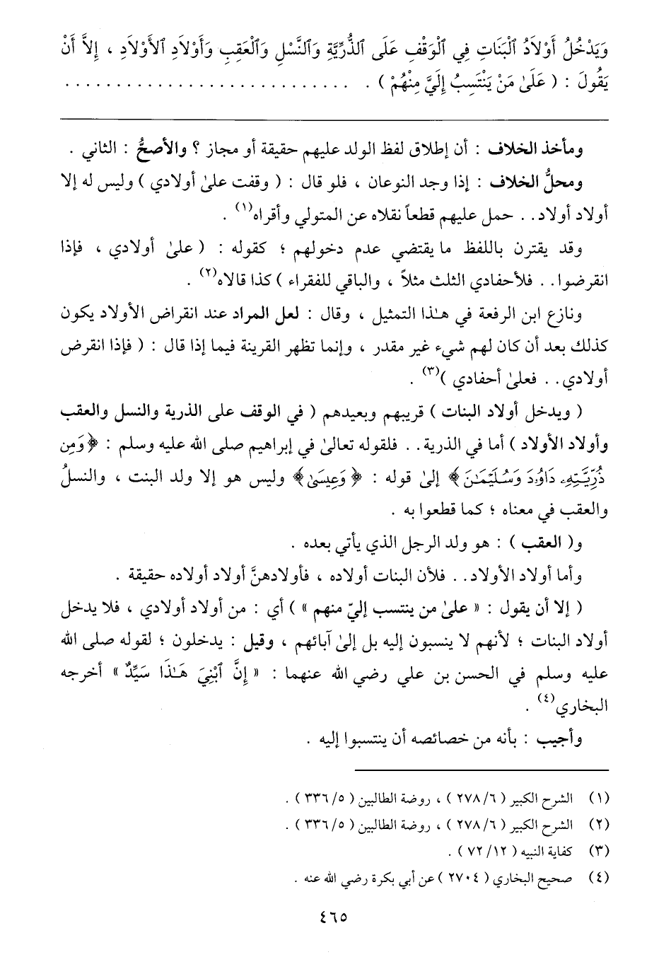 (إلا أن يقول: "على من ينتسب إليّ منهم") أي: من أولاد أولادي، فلا يدخل أولاد البنات؛ لأنهم لا ينسبون إليه بل إلى آبائهم، وقيل: يدخلون؛ لقوله صلى الله عليه وسلم في الحسن بن علي رضي الله عنهما: "إِنَّ ابْنِيَ هَذَا سَيِّدٌ" أخرجه البخاري (٤).