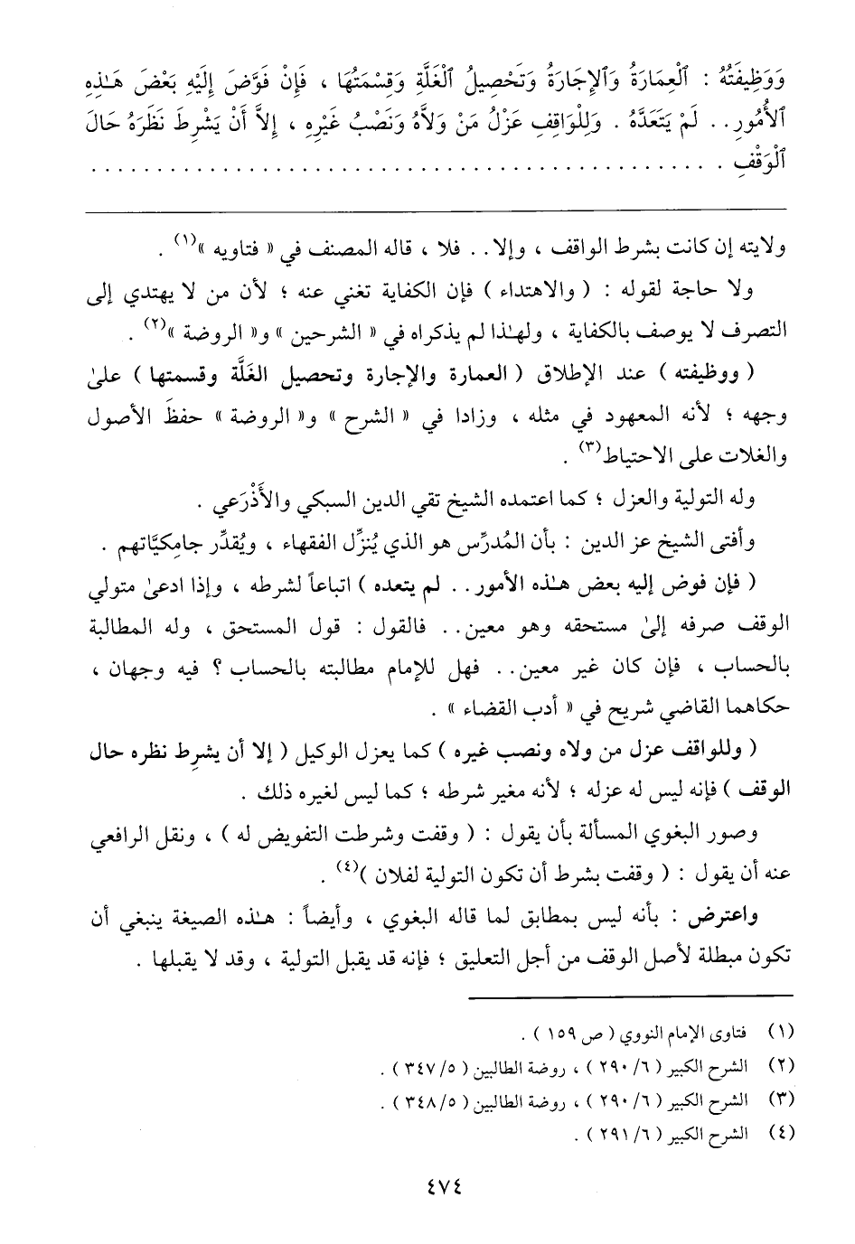 وصور البغوي المسألة بأن يقول: (وقفت وشرطت التفويض له)، ونقل الرافعي عنه أن يقول: (وقفت بشرط أن تكون التولية لفلان) (٤).
