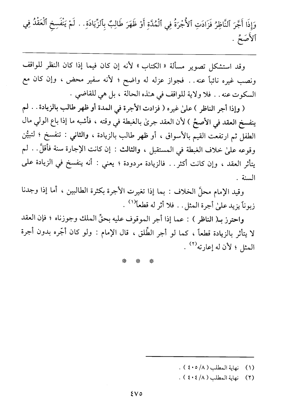 (إذا أجر الناظر) على غيره (فزادت الأجرة في المدة أو ظهر طالب بالزيادة .. لم ينفسخ العقد في الأصحِّ) لأن العقد جرى بالغبطة في وقته، فأشبه ما إذا باع الولي مال الطفل ثم ارتفعت القيم بالأسواق، أو ظهر طالب بالزيادة، والثاني: تنفسخ؛ لتبيُّن وقوعه على خلاف الغبطة في المستقبل، والثالث: إن كانت الإجارة سنة فأقلَّ .. لم يتأثر العقد، وإن كانت أكثر .. فالزيادة مردودة؛ يعني: أنه ينفسخ في الزيادة على السنة.