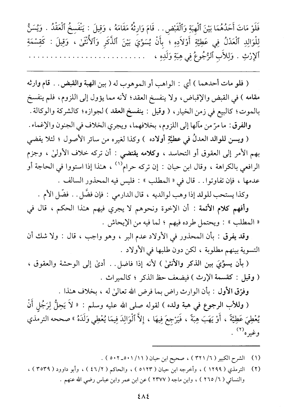 (ويسن للوالد العدلُ في عطيَّةِ أولاده) وكذا لغيره من سائر الأصول؛ لئلا يفضي بهم الأمر إلى العقوق أو التحاسد، وكلامه يقتضي: أن تركه خلاف الأولى، وجزم الرافعي بالكراهة، وقال ابن حبان: إن تركه حرام (١)، هذا إذا استووا في الحاجة أو عدمها، فإن تفاوتوا .. قال في "المطلب": فليس فيه المحذور السالف.