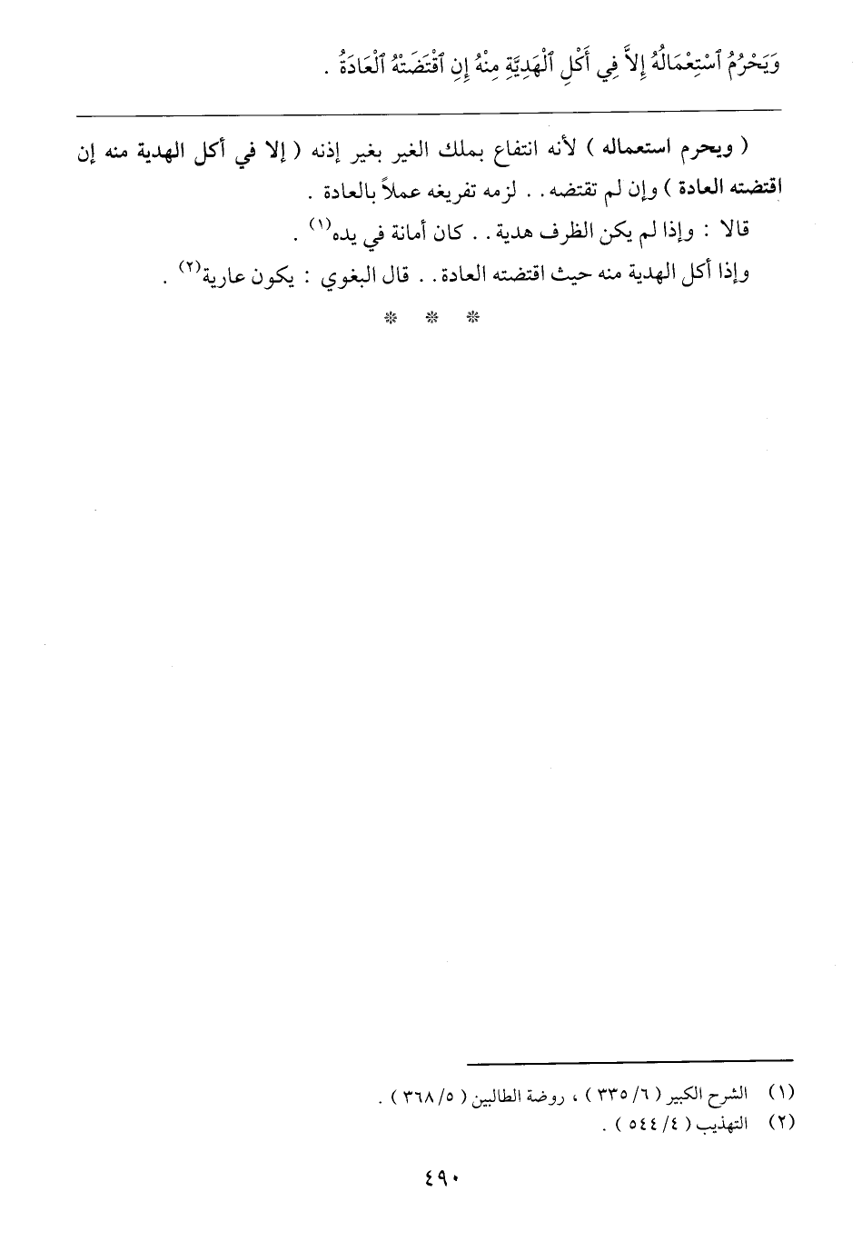 (ويحرم استعماله) لأنه انتفاع بملك الغير بغير إذنه (إلا في أكل الهدية منه إن اقتصته العادة) وإن لم تقتضه .. لزمه تفريغه عملًا بالعادة.