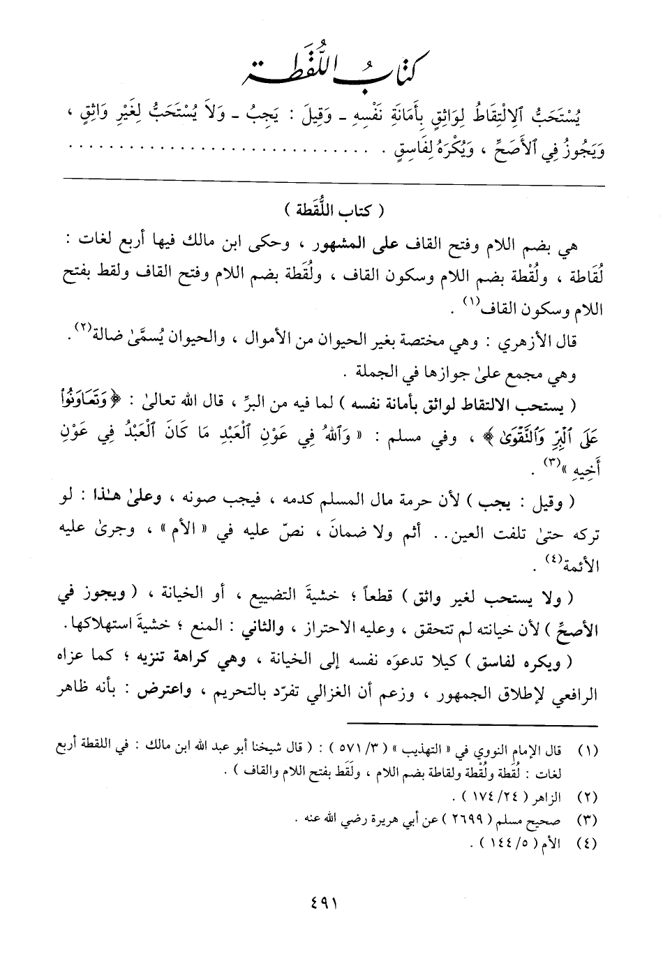 (يستحب الالتقاط لواثق بأمانة نفسه) لما فيه من البرَّ، قال الله تعالى: {وَتَعَاوَنُوا عَلَى الْبِرِّ وَالتَّقْوَى}، وفي مسلم: "وَاللهُ فِي عَوْنِ الْعَبْدِ مَا كَانَ الْعَبْدُ فِي عَوْنِ أَخِيهِ" (٣).