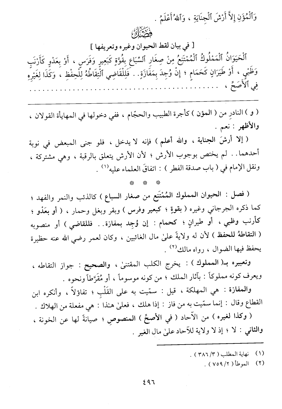 (فصل: الحيوان المملوك المُمْتَنِع من صغار السباع) كالذئب والنمر والفهد؛ كما ذكره الجرجاني وغيره (بقوةٍ؛ كبعير وفرس) وبقر وبغل وحمار، (أو بعَدْو؛ كأرنب وظبي، أو طيرانٍ؛ كحمام: إن وُجِد بمفازة .. فللقاضي) أو منصوبه (التقاطهُ للحفظ) لأن له ولايةً على مال الغائبين، وكان لعمر رضي الله عنه حظيرة يحفظ فيها الضوال، رواه مالك (٢).