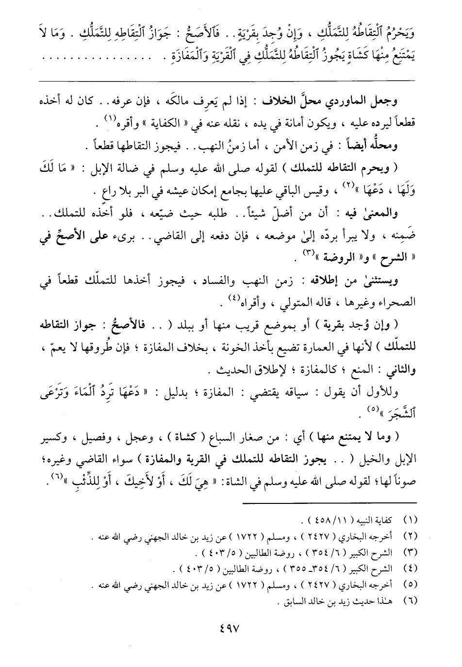 ويستثنى من إطلاقه: زمن النهب والفساد، فيجوز أخذها للتملّك قطعًا في الصحراء وغيرها، قاله المتولي، وأقراه (٤).