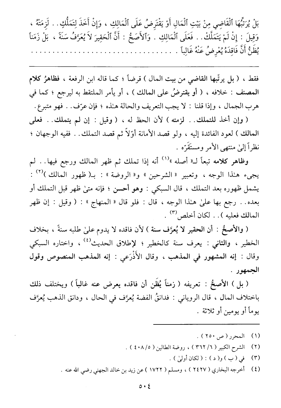 (والأصحُّ: أن الحقير لا يُعرَّف سنة) لأن فاقده لا يدوم على طلبه سنةً، بخلاف الخطير، والثاني: يعرف سنة كالخطير؛ لإطلاق الحديث (٤)، واختاره السبكي وقال: إنه المشهور في المذهب، وقال الأَذْرَعي: إنه المذهب المنصوص وقول الجمهور.