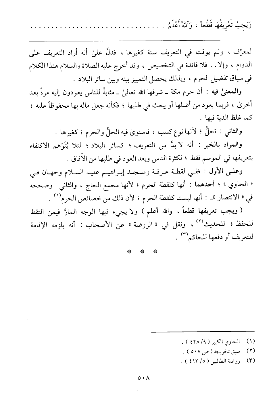 (ويجب تعريفها قطعًا، والله أعلم) ولا يجيء فيها الوجه المارُّ فيمن التقط للحفظ؛ للحديث (٢)، ونقل في "الروضة" عن الأصحاب: أنه يلزمه الإقامة للتعريف أو دفعها للحاكم (٣).