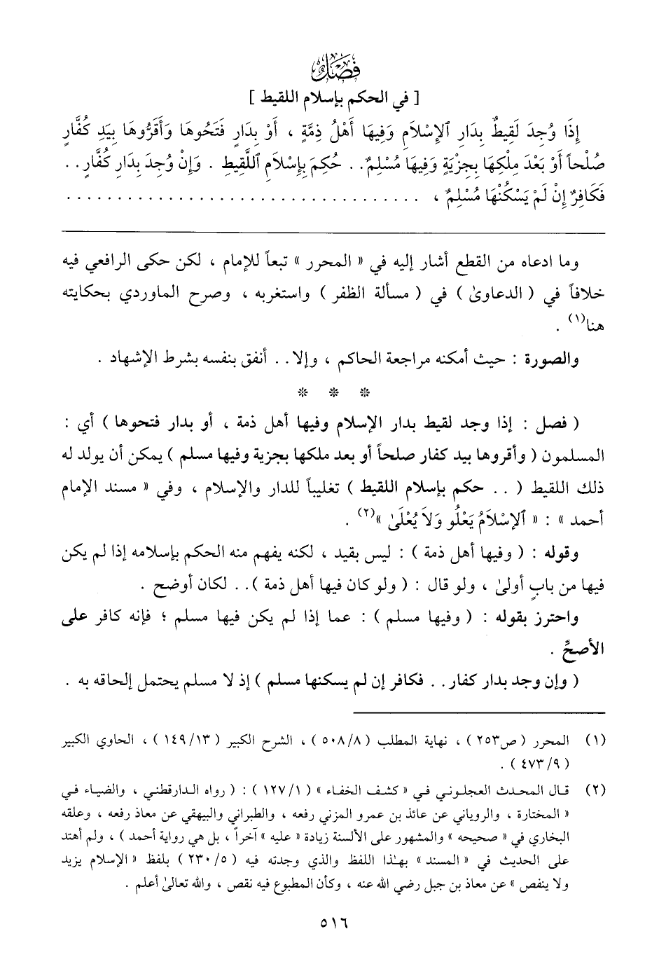(فصل: إذا وجد لقيط بدار الإسلام وفيها أهل ذمة، أو بدار فتحوها) أي: المسلمون (وأقروها بيد كفار صلحًا أو بعد ملكها بجزية وفيها مسلم) يمكن أن يولد له ذلك اللقيط ( .. حكم بإسلام اللقيط) تغليبًا للدار والإسلام، وفي "مسند الإمام أحمد": "الإسْلَامُ يَعْلُو وَلَا يُعْلَى" (٢).