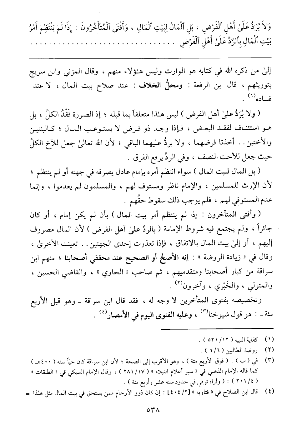 (وأفتى المتأخرون: إذا لم ينتظم أمر بيت المال) بأن لم يكن إمام، أو كان جائرًا، ولم يجتمع فيه شروط الإمامة (بالردِّ على أهل الفرض) لأن المال مصروف إليهم، أو إلى بيت المال بالاتفاق، فإذا تعذرت إحدى الجهتين .. تعينت الأخرى، وقال في "زيادة الروضة": إنه الأصحُّ أو الصحيح عند محققي أصحابنا؛ منهم ابن سراقة من كبار أصحابنا ومتقدميهم، ثم صاحب "الحاوي"، والقاضي الحسين، والمتولي، والخَبْري، وآخرون (٢).