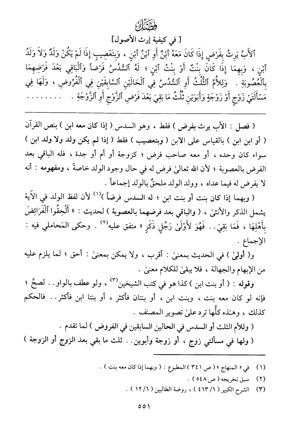 (فصل: الأب يرث بفرض) فقط، وهو السدس (إذا كان معه ابن) بنص القرآن (أو ابن ابن) بالقياس على الابن (وبتعصيب) فقط (إذا لم يكن ولد ولا ولد ابن) سواء كان وحده، أو معه صاحب فرض؛ كزوجة أو أم أو جدة، فله الباقي بعد الفرض بالعصوبة؛ لأن الله تعالى فرض له في حال وجود الولد خاصةً، ومفهومه: أنه لا يفرض له فيما عداه، وولد الولد ملحق بالولد إجماعًا.
