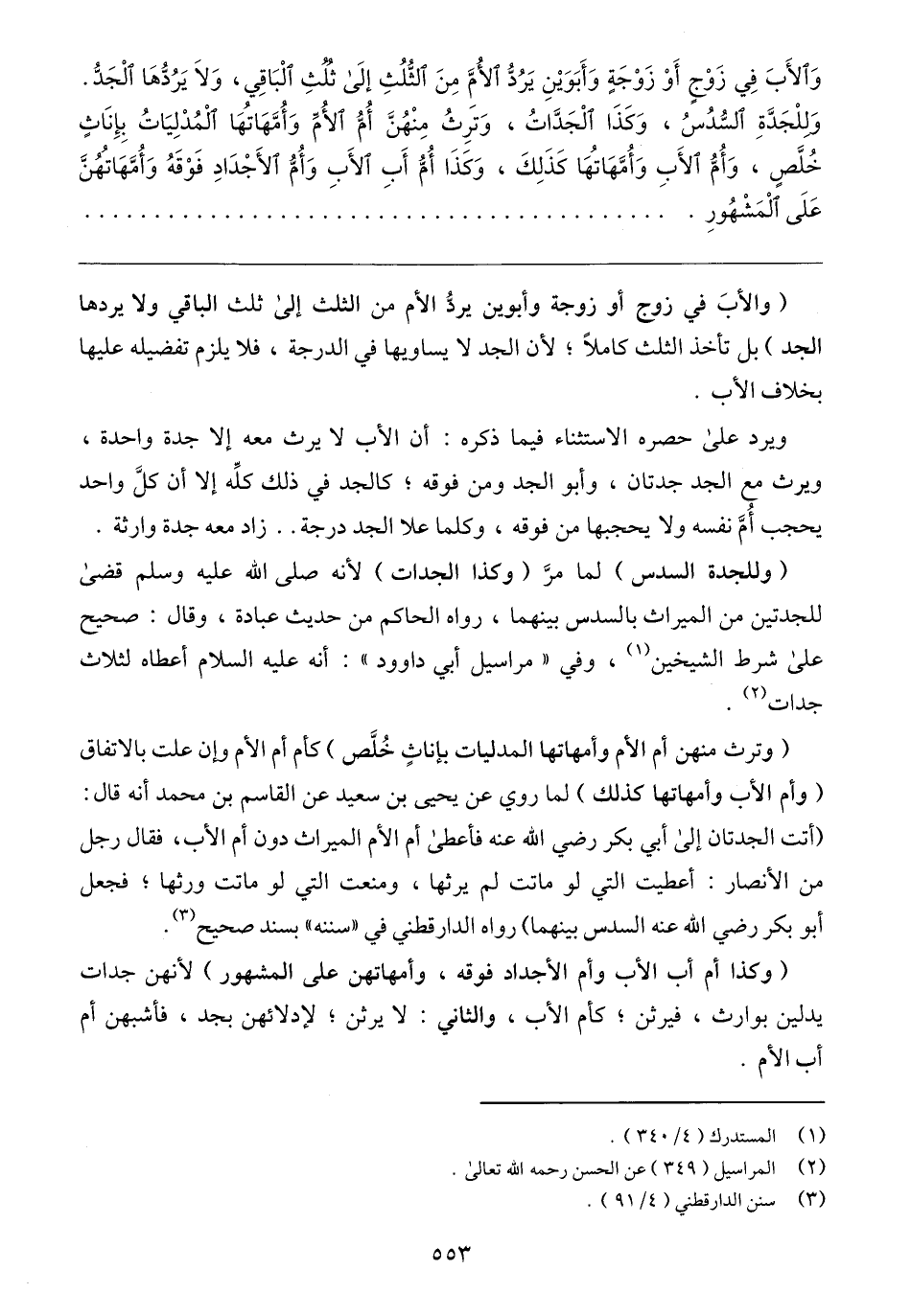 (وللجدة السدس) لما مرَّ (وكذا الجدات) لأنه صلى الله عليه وسلم قضى للجدتين من الميراث بالسدس بينهما، رواه الحاكم من حديث عبادة، وقال: صحيح على شرط الشيخين (١)، وفي "مراسيل أبي داوود": أنه عليه السلام أعطاه لثلاث جدات (٢).