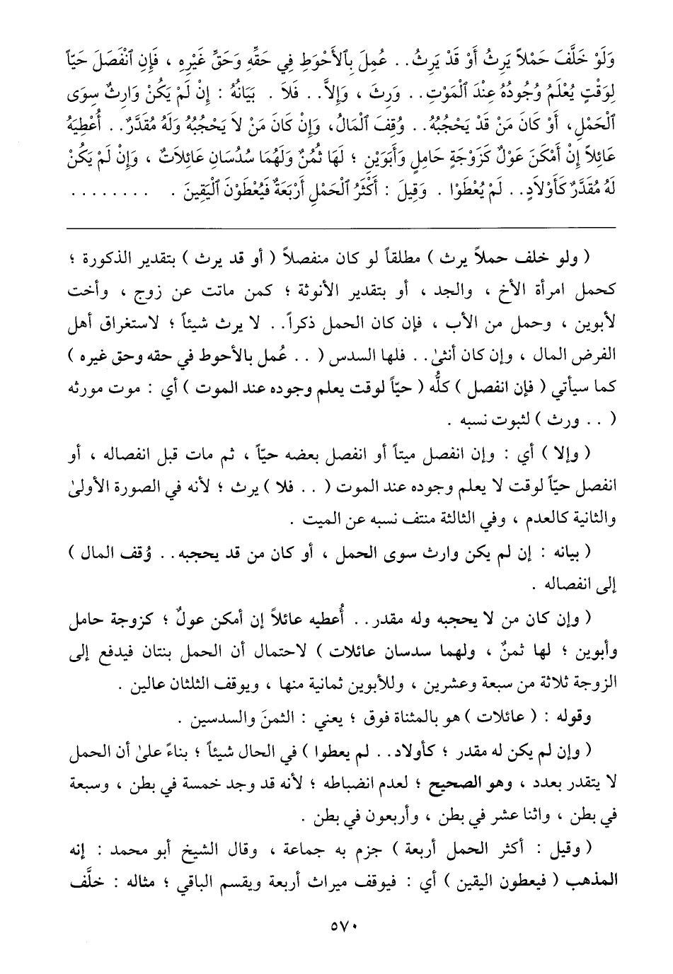 (ولو خلف حملًا يرث) مطلقًا لو كان منفصلًا (أو قد يرث) بتقدير الذكورة؛ كحمل امرأة الأخ، والجد، أو بتقدير الأنوثة؛ كمن ماتت عن زوج، وأخت لأبوين، وحمل من الأب، فإن كان الحمل ذكرًا .. لا يرث شيئًا؛ لاستغراق أهل الفرض المال، وإن كان أنثى .. فلها السدس ( .. عُمل بالأحوط في حقه وحق غيره) كما سيأتي (فإن انفصل) كلُّه (حيًّا لوقت يعلم وجوده عند الموت) أي: موت مورثه ( .. ورث) لثبوت نسبه.