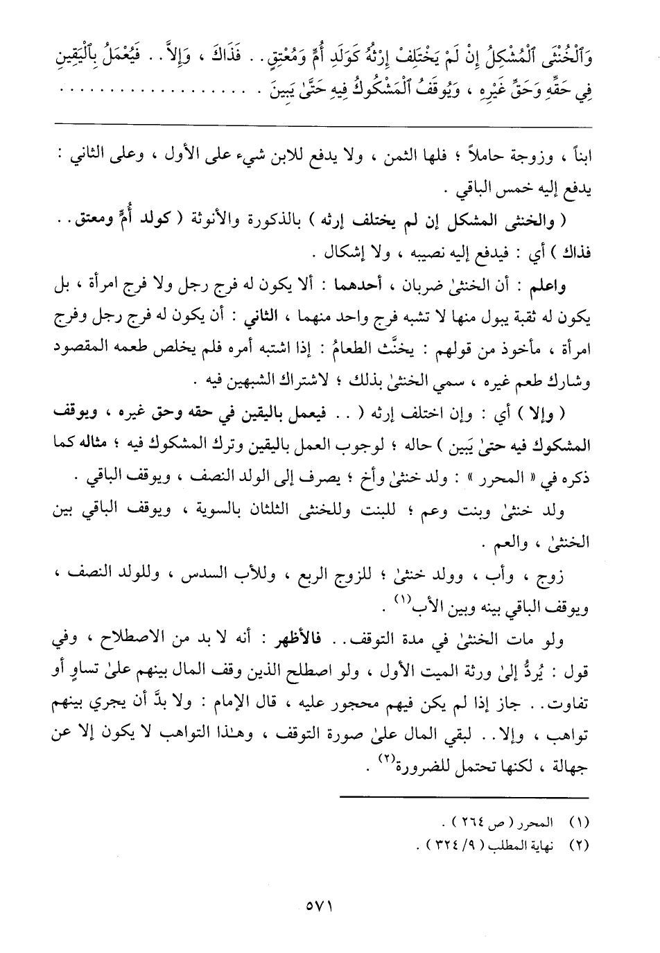 ولو مات الخنثى في مدة التوقف .. فالأظهر: أنه لا بد من الاصطلاح، وفي قول: يُردُّ إلى ورثة الميت الأول، ولو اصطلح الذين وقف المال بينهم على تساوٍ أو تفاوت .. جاز إذا لم يكن فيهم محجور عليه، قال الإمام: ولا بدَّ أن يجري بينهم تواهب، وإلا .. لبقي المال على صورة التوقف، وهذا التواهب لا يكون إلا عن جهالة، لكنها تحتمل للضرورة (٢).