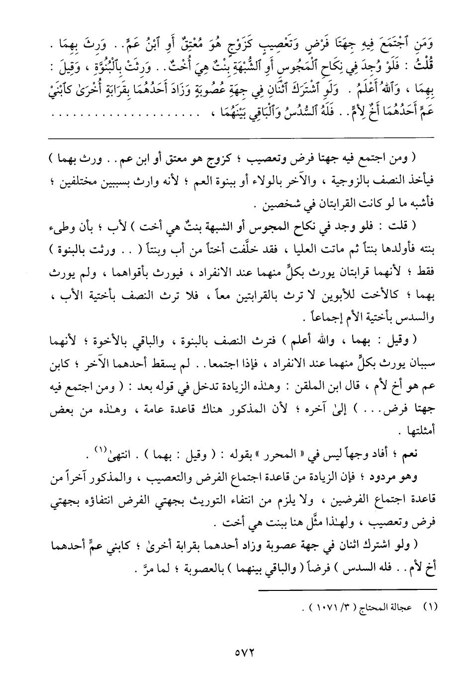 وهو مردود؛ فإن الزيادة من قاعدة اجتماع الفرض والتعصيب، والمذكور آخرًا من قاعدة اجتماع الفرضين، ولا يلزم من انتفاء التوريث بجهتي الفرض انتفاؤه بجهتي فرض وتعصيب، ولهذا مثَّل هنا ببنت هي أخت.