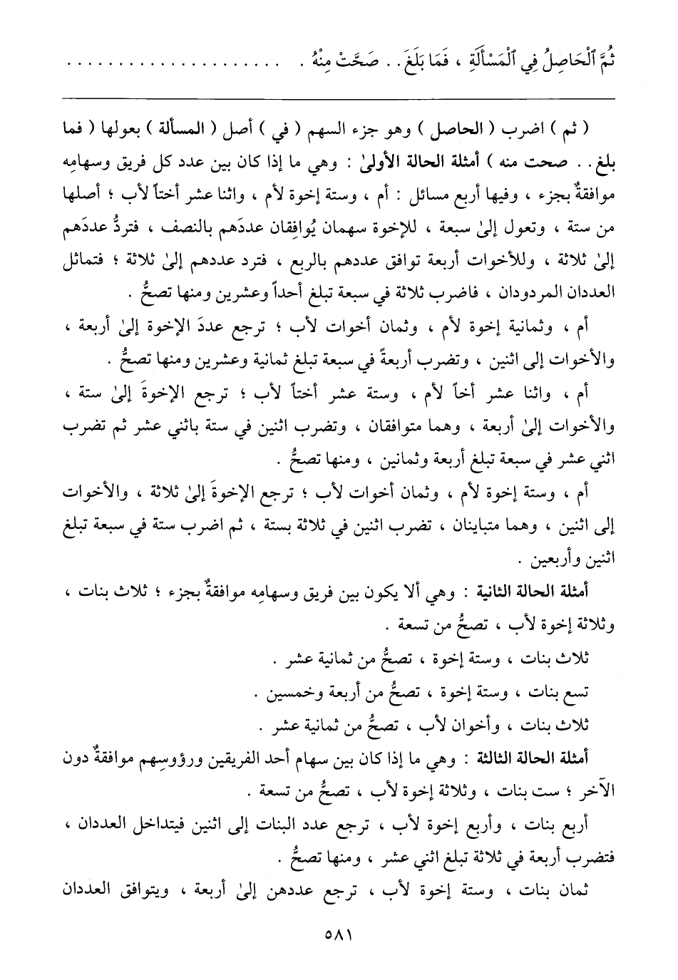 (ثم) اضرب (الحاصل) وهو جزء السهم (في) أصل (المسألة) بعولها (فما بلغ .. صحت منه) أمثلة الحالة الأولى: وهي ما إذا كان بين عدد كل فريق وسهامِه موافقةٌ بجزء، وفيها أربع مسائل: أم، وستة إخوة لأم، واثنا عشر أختًا لأب؛ أصلها من ستة، وتعول إلى سبعة، للإخوة سهمان يُوافِقان عددَهم بالنصف، فتردُّ عددَهم إلى ثلاثة، وللأخوات أربعة توافق عددهم بالربع، فترد عددهم إلى ثلاثة؛ فتماثل العددان المردودان، فاضرب ثلاثة في سبعة تبلغ أحدًا وعشرين ومنها تصحُّ.