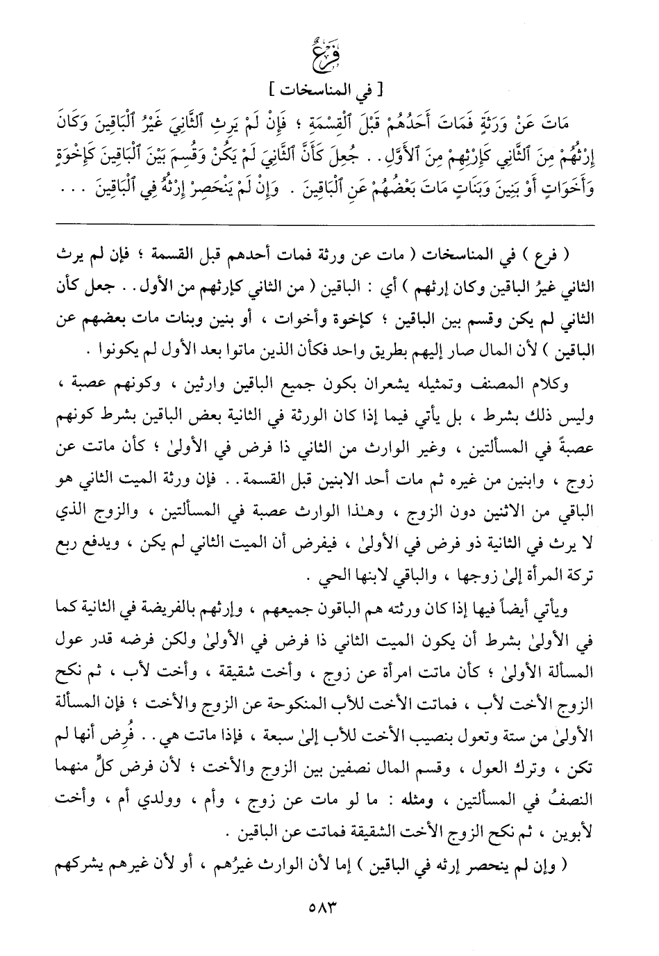 (فرع) في المناسخات (مات عن ورثة فمات أحدهم قبل القسمة؛ فإن لم يرث الثاني غيرُ الباقين وكان إرثهم) أي: الباقين (من الثاني كإرثهم من الأول .. جعل كأن الثاني لم يكن وقسم بين الباقين؛ كإخوة وأخوات، أو بنين وبنات مات بعضهم عن الباقين) لأن المال صار إليهم بطريق واحد فكأن الذين ماتوا بعد الأول لم يكونوا.