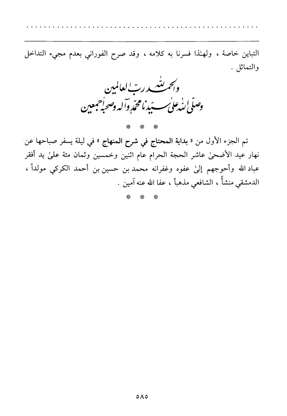 تم الجزء الأول من "بداية المحتاج في شرح المنهاج" في ليلة يسفر صباحها عن نهار عيد الأضحى عاشر الحجة الحرام عام اثنين وخمسين وثمان مئة على يد أفقر عباد الله وأحوجهم إلى عفوه وغفرانه محمد بن حسين بن أحمد الكركي مولدًا، الدمشقي منشأً، الشافعي مذهبًا، عفا الله عنه آمين.