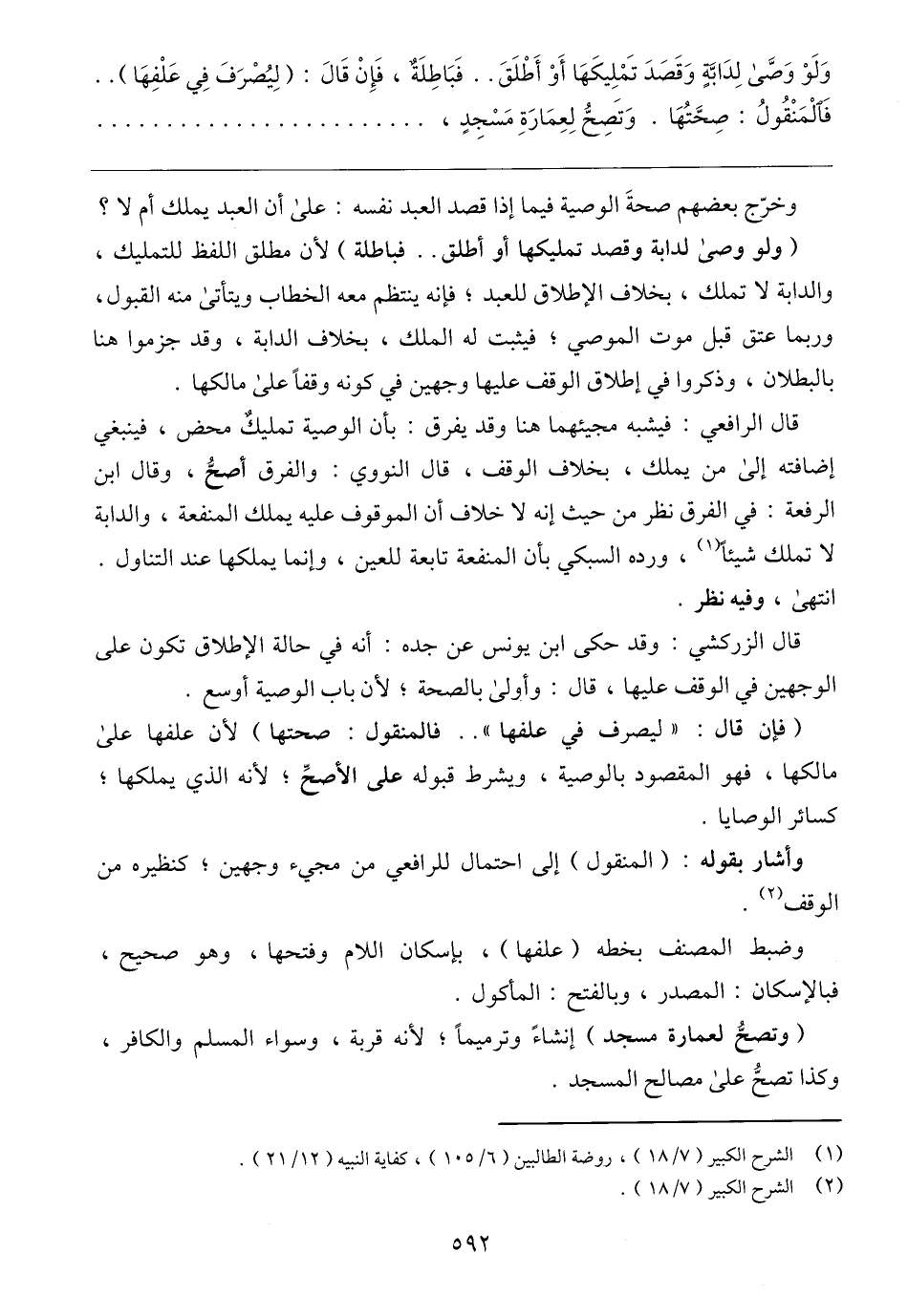قال الرافعي: فيشبه مجيئهما هنا وقد يفرق: بأن الوصية تمليكٌ محض، فينبغي إضافته إلى من يملك، بخلاف الوقف، قال النووي: والفرق أصحُّ، وقال ابن الرفعة: في الفرق نظر من حيث إنه لا خلاف أن الموقوف عليه يملك المنفعة، والدابة لا تملك شيئًا (١)، ورده السبكي بأن المنفعة تابعة للعين، وإنما يملكها عند التناول.