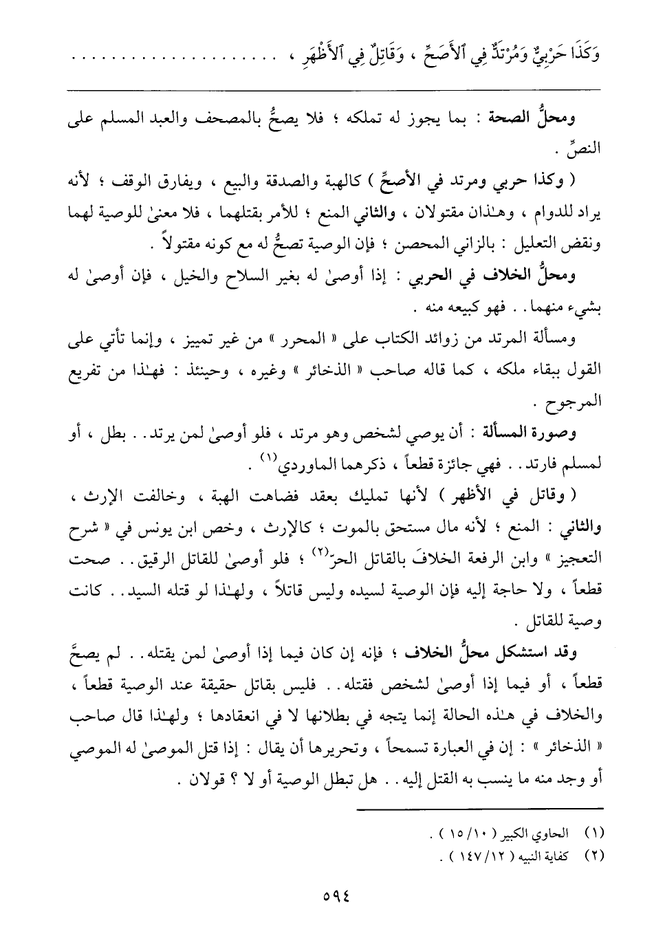 وصورة المسألة: أن يوصي لشخص وهو مرتد، فلو أوصى لمن يرتد .. بطل، أو لمسلم فارتد .. فهي جائزة قطعًا، ذكرهما الماوردي (١).