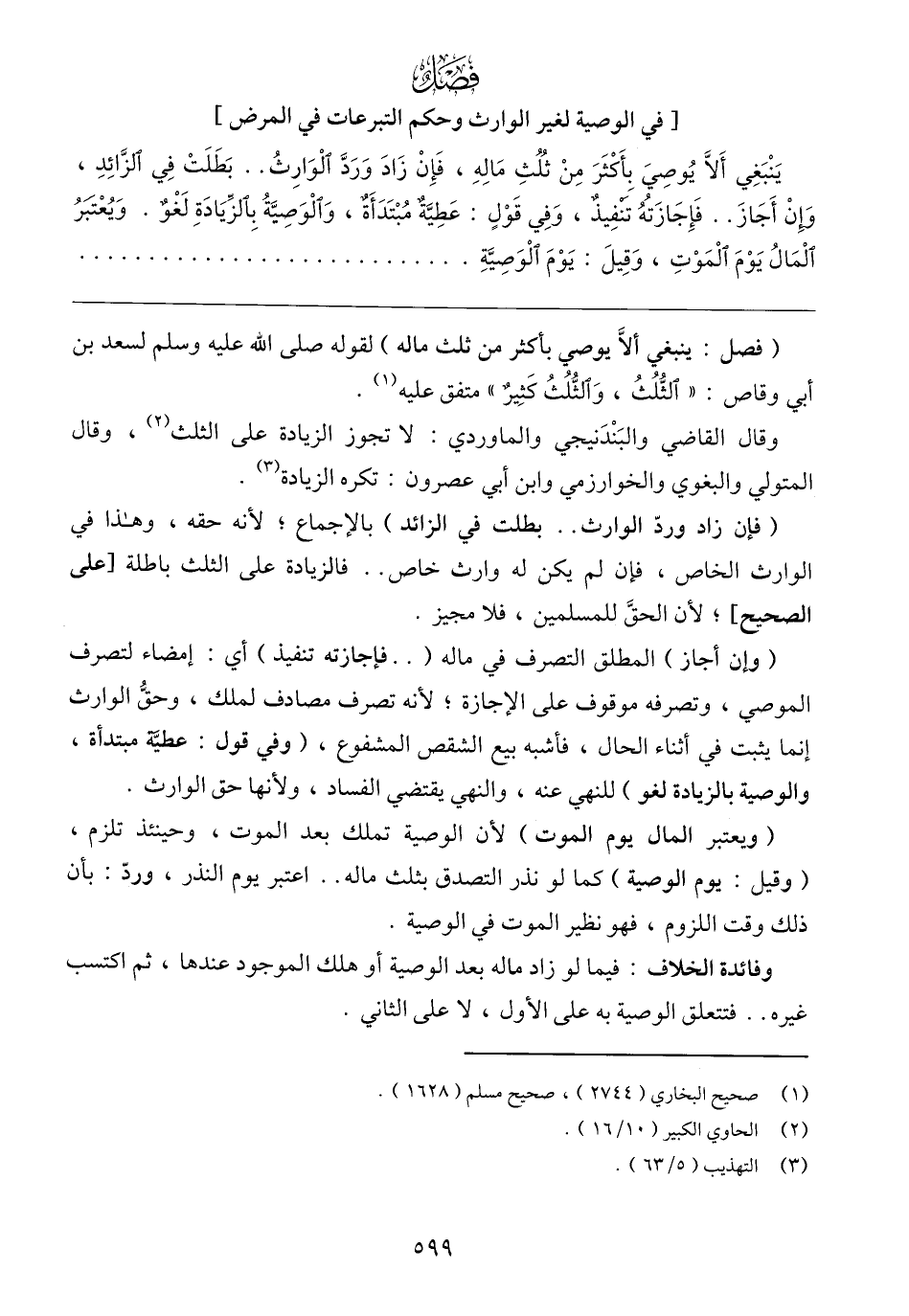 (فصل: ينبغي ألَّا يوصي بأكثر من ثلث ماله) لقوله صلى الله عليه وسلم لسعد بن أبي وقاص: "الثُّلُثُ، وَالثُّلُثُ كَثيرٌ" متفق عليه (١).