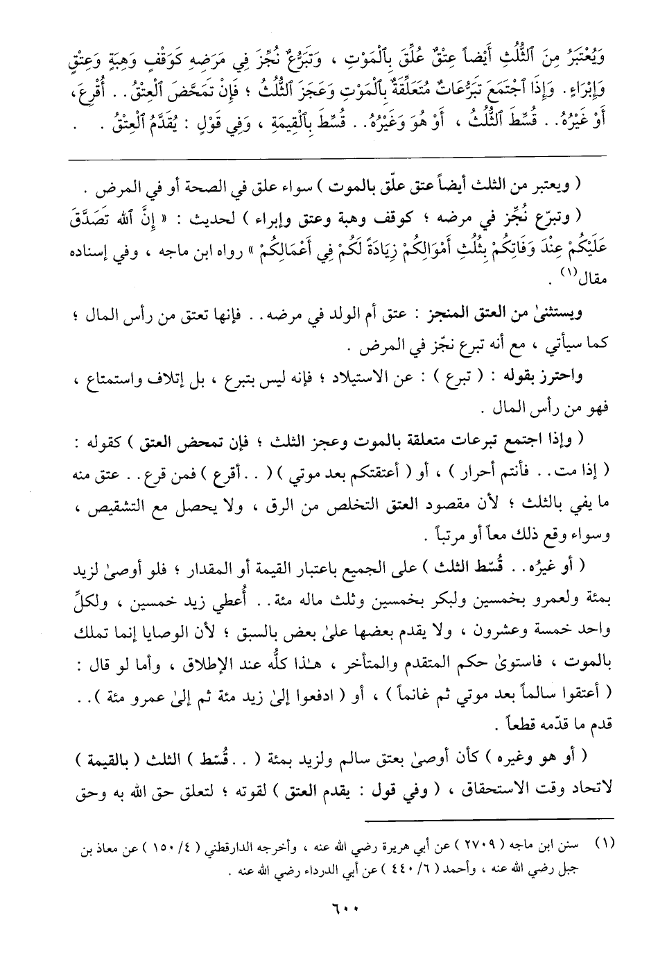 (وتبرّع نُجِّز في مرضه؛ كوقف وهبة وعتق وإبراء) لحديث: "إِنَّ الله تَصَدَّقَ عَلَيْكُمْ عِنْدَ وَفَاتِكُمْ بِثُلُثِ أَمْوَالِكُمْ زِيَادَةً لَكُمْ فِي أَعْمَالِكُمْ" رواه ابن ماجه، وفي إسناده مقال (١).