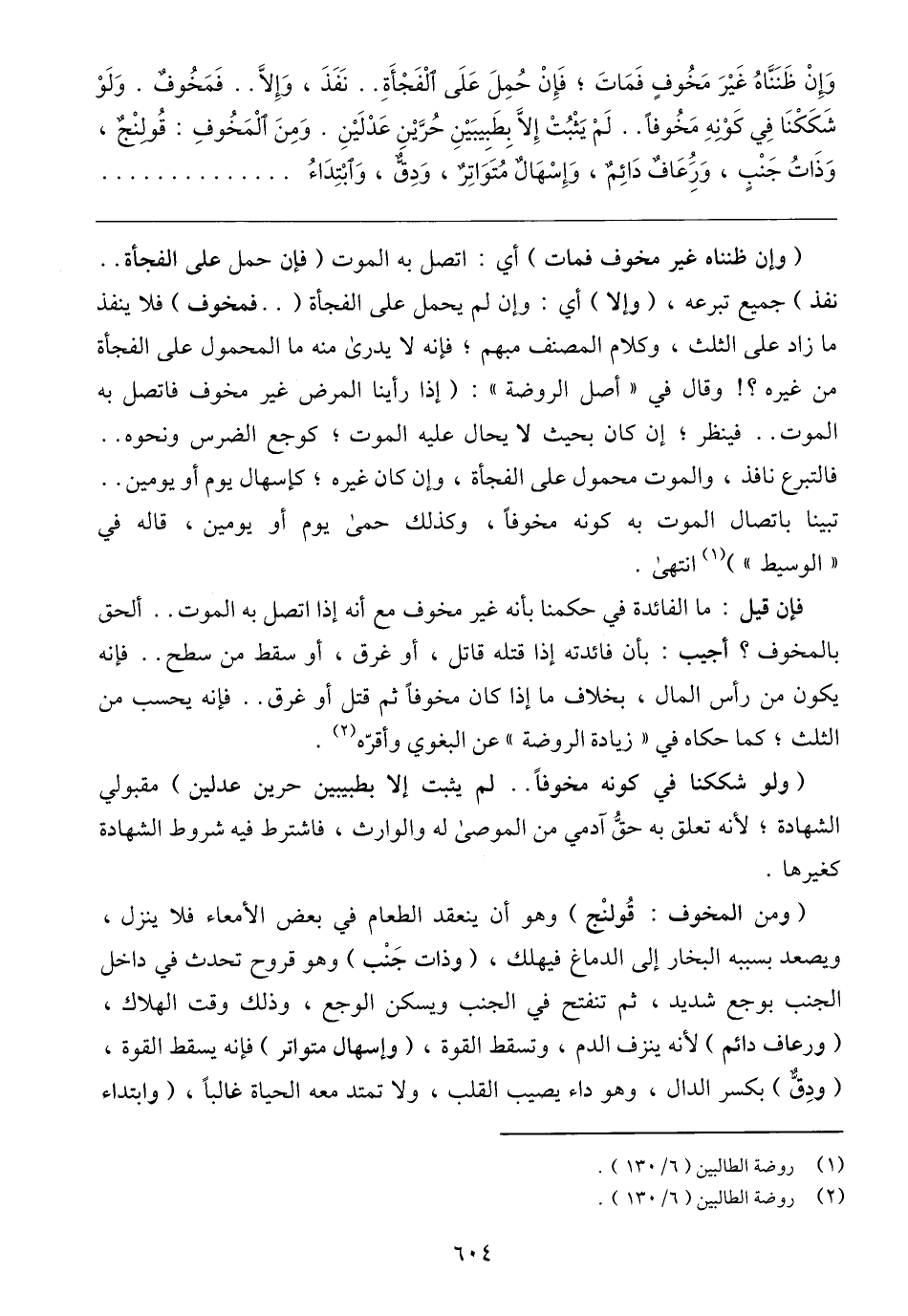 فإن قيل: ما الفائدة في حكمنا بأنه غير مخوف مع أنه إذا اتصل به الموت .. ألحق بالمخوف؟ أجيب: بأن فائدته إذا قتله قاتل، أو غرق، أو سقط من سطح .. فإنه يكون من رأس المال، بخلاف ما إذا كان مخوفًا ثم قتل أو غرق .. فإنه يحسب من الثلث؛ كما حكاه في "زيادة الروضة" عن البغوي وأقرّه (٢).