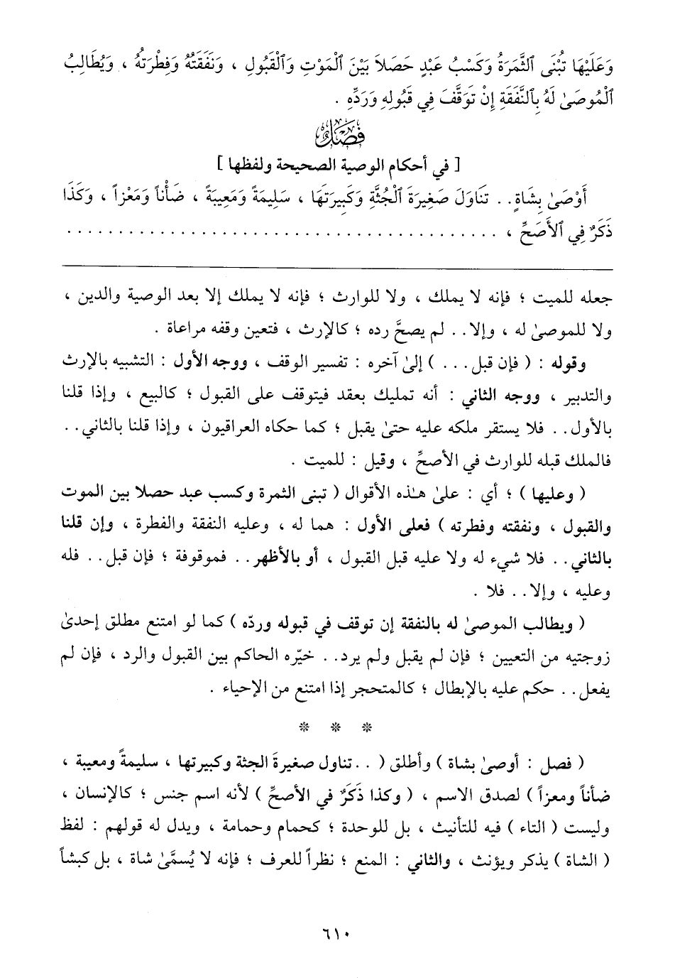 (فصل: أوصى بشاة) وأطلق ( .. تناول صغيرةَ الجثة وكبيرتها، سليمةً ومعيبة، ضأنًا ومعزًا) لصدق الاسم، (وكذا ذَكَرٌ في الأصحِّ) لأنه اسم جنس؛ كالإنسان، وليست (التاء) فيه للتأنيث، بل للوحدة؛ كحمام وحمامة، ويدل له قولهم: لفظ (الشاة) يذكر ويؤنث، والثاني: المنع؛ نظرًا للعرف؛ فإنه لا يُسمَّى شاة، بل كبشًا