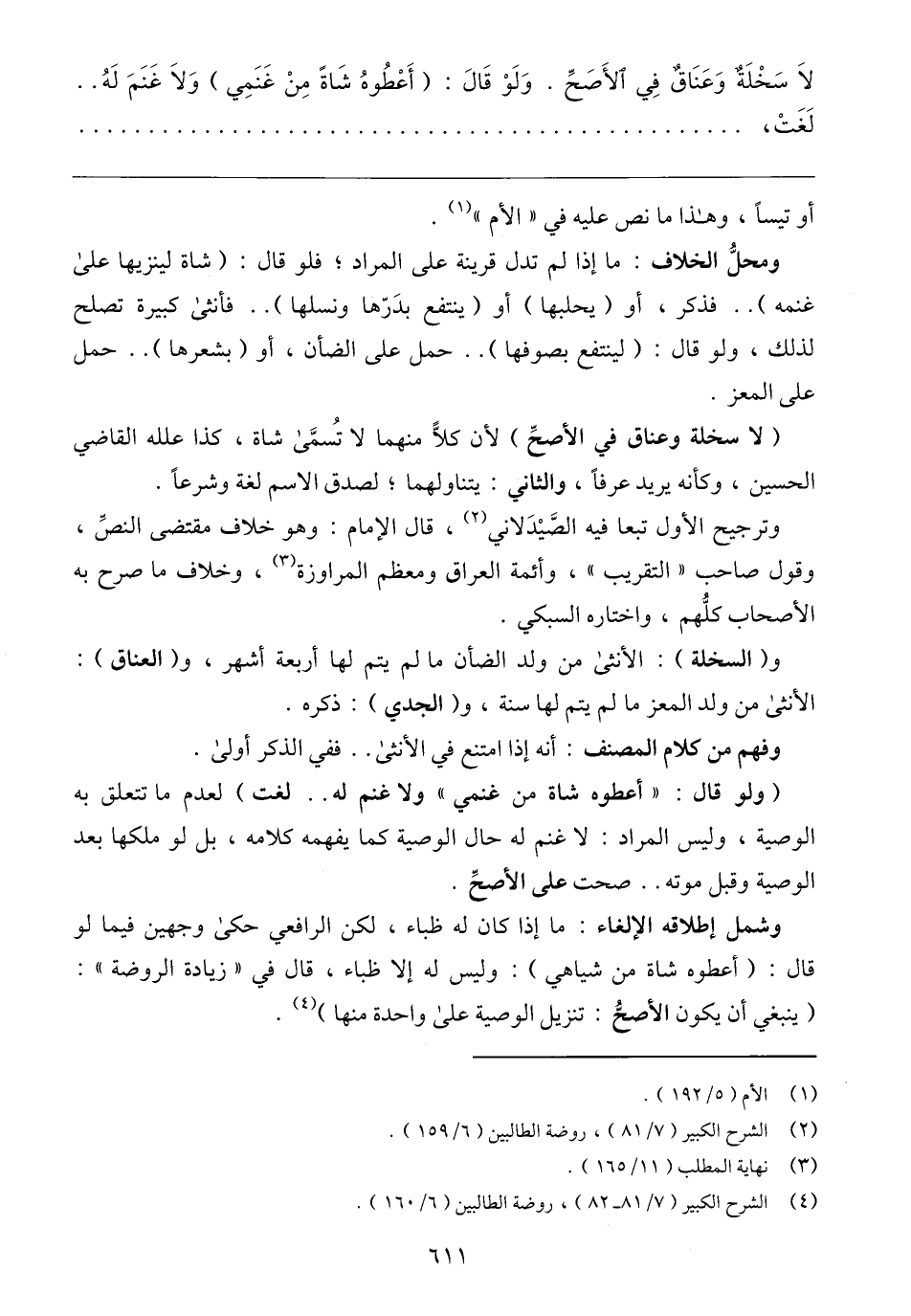 وشمل إطلاقه الإلغاء: ما إذا كان له ظباء، لكن الرافعي حكى وجهين فيما لو قال: (أعطوه شاة من شياهي): وليس له إلا ظباء، قال في "زيادة الروضة": (ينبغي أن يكون الأصحُّ: تنزيل الوصية على واحدة منها) (٤).