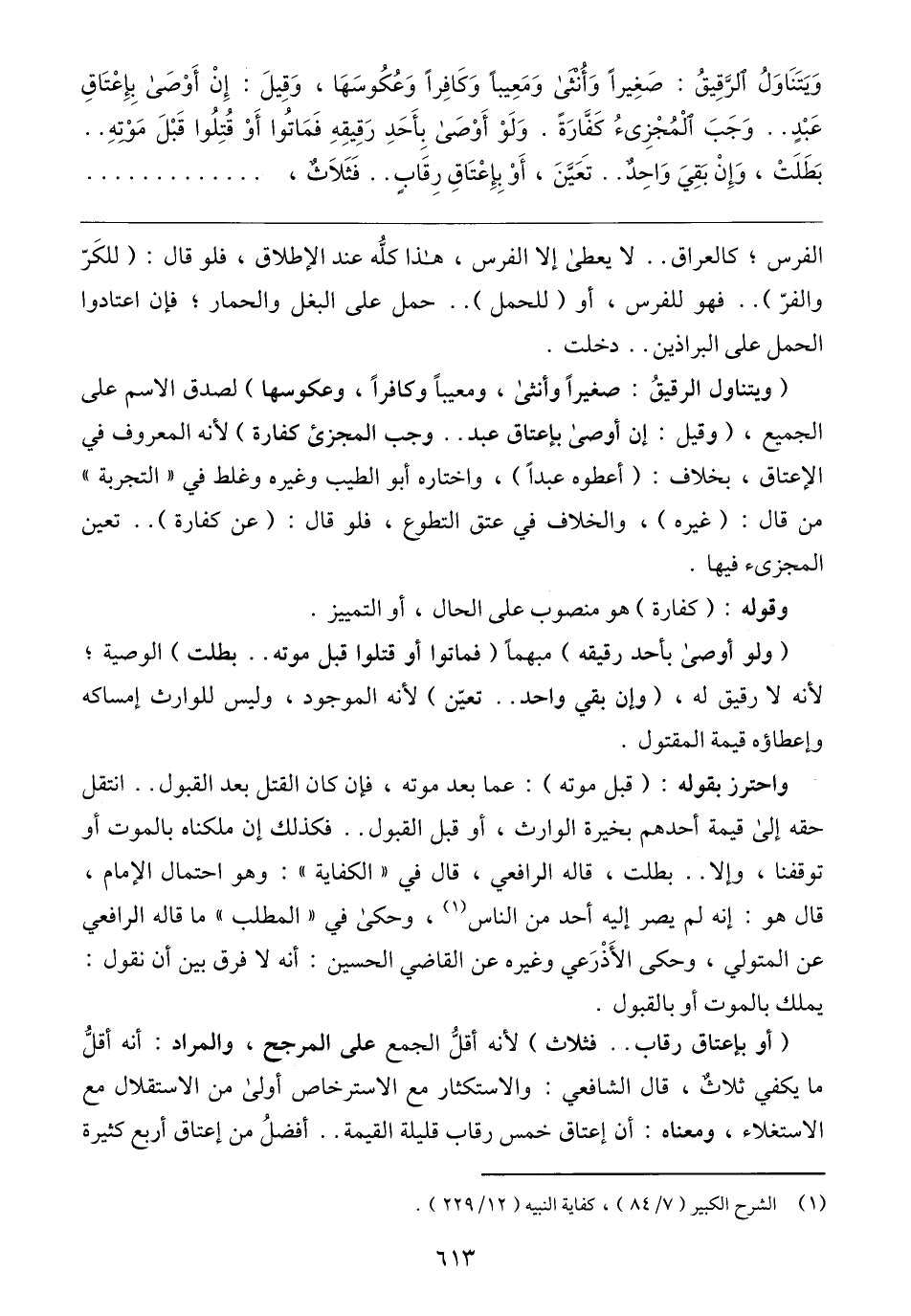 (ويتناول الرقيقُ: صغيرًا وأنثى، ومعيبًا وكافرًا، وعكوسها) لصدق الاسم على الجميع، (وقيل: إن أوصى بإعتاق عبد .. وجب المجزئ كفارة) لأنه المعروف في الإعتاق، بخلاف: (أعطوه عبدًا)، واختاره أبو الطيب وغيره وغلط في "التجربة" من قال: (غيره)، والخلاف في عتق التطوع، فلو قال: (عن كفارة) .. تعين المجزئ فيها.