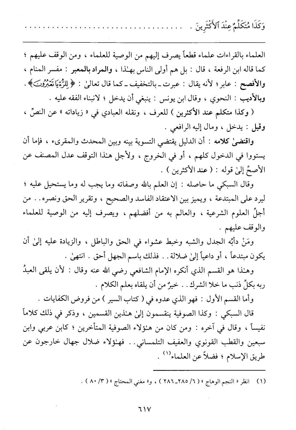 وقال السبكي ما حاصله: إن العلم بالله وصفاته وما يجب له وما يستحيل عليه؛ ليرد على المبتدعة، ويميز بين الاعتقاد الفاسد والصحيح، وتقرير الحق ونمره .. من أجلِّ العلوم الشرعية، والعالم به من أفضلهم، ويصرف إليه من الوصية للعلماء والوقف عليهم.